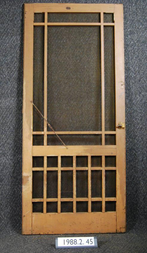 Exterior screen door. Frame with lattice work. Has brass mesh screen. Has one spring hinge (originally there were three). Interior side has lever-handle latch. Exterior has knob. Also has diagonal brace with turnbuckle. Painted brown on both sides.