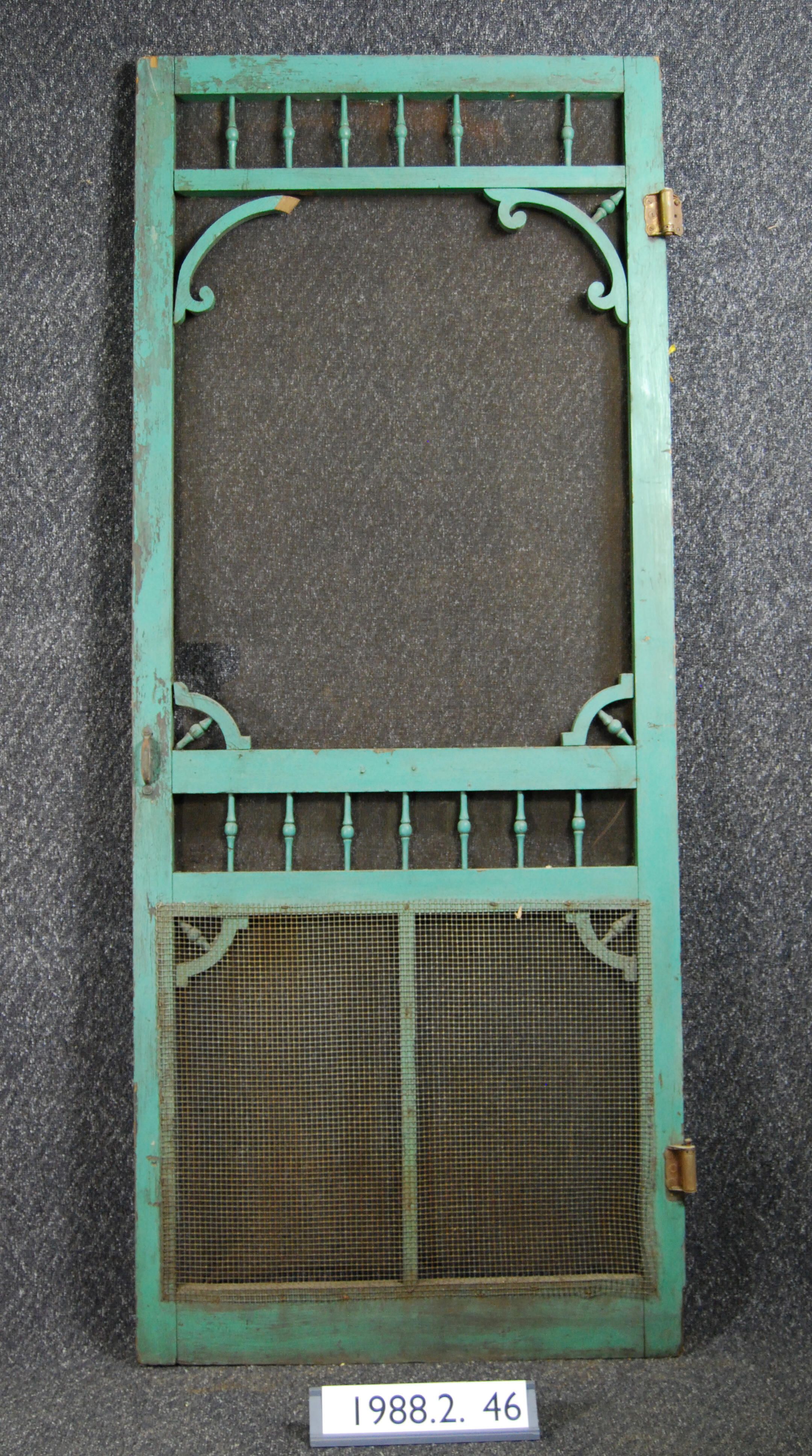 Exterior screen door. Frame divided to form series of openings and decorated with spindle work and fret work scrolls. Covered with iron screen and later iron mesh. Door has two spring-loaded bommer-type hinges and plain iron handle. Interior has hook. Door has minor damage and missing pieces. Painted green.