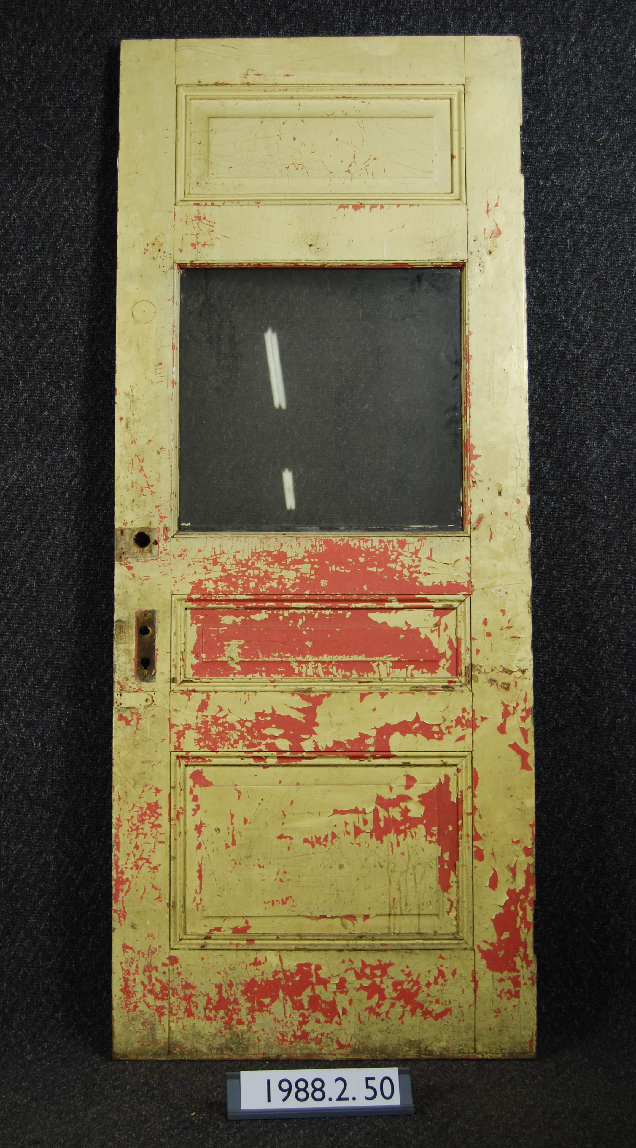 Interior / Exterior door. Three panels. One at top and two at bottom with applied moldings. Single opening with clear glass pane. Mortice lock and all hardware are missing. One side painted yellow, which is peeling to reveal pink - other side is painted dark grey.