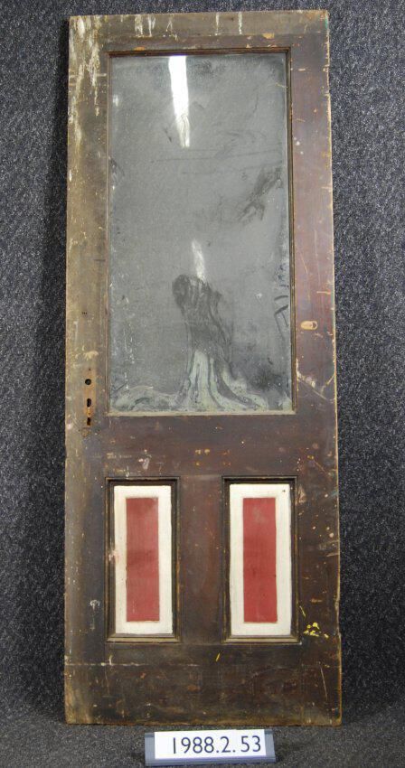 Interior / Exterior door. Two panels with applied moldings. Single opening with glass pane. Mortice lock and all other hardware missing. Both sides of door are varnished, except exterior of panels which are painted cream and red.