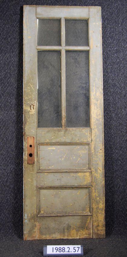 Exterior door. Two panels with applied moldings. Four openings with clear glass panes divided by muntins which form symbol of Christian Cross. Mortice lock and all hardware are missing. One side is painted blue and white - the other side is painted grey.