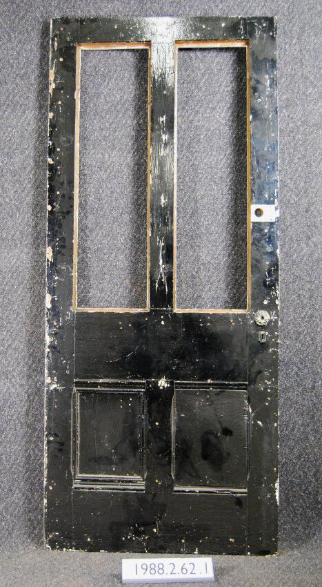 Exterior door. Two panels (one is modern replacement) with applied moldings. Stop-chamfered stiles. Two openings. Glass panes are missing. Has mortice lock. Two brass escutcheon plates. One key hole escutcheon. Interior side is painted black -- exterior side is painted white.