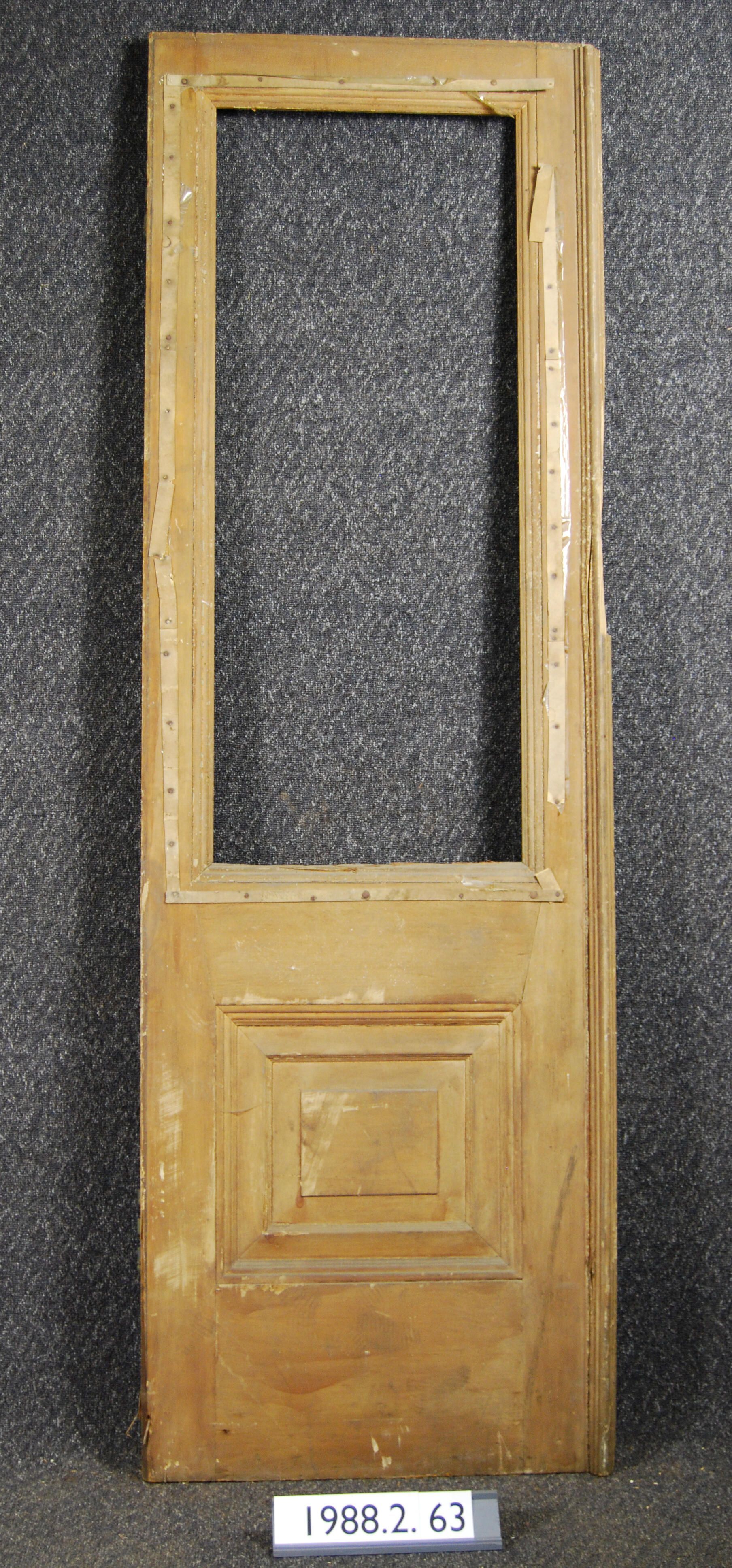 Interior / Exterior door. Single panel with applied moldings. Single opening missing glass pane. Has astragal molding. Has two brass hinge leaves. Missing strike plate and possible sliding bolt. Remnants of varnish on both sides.