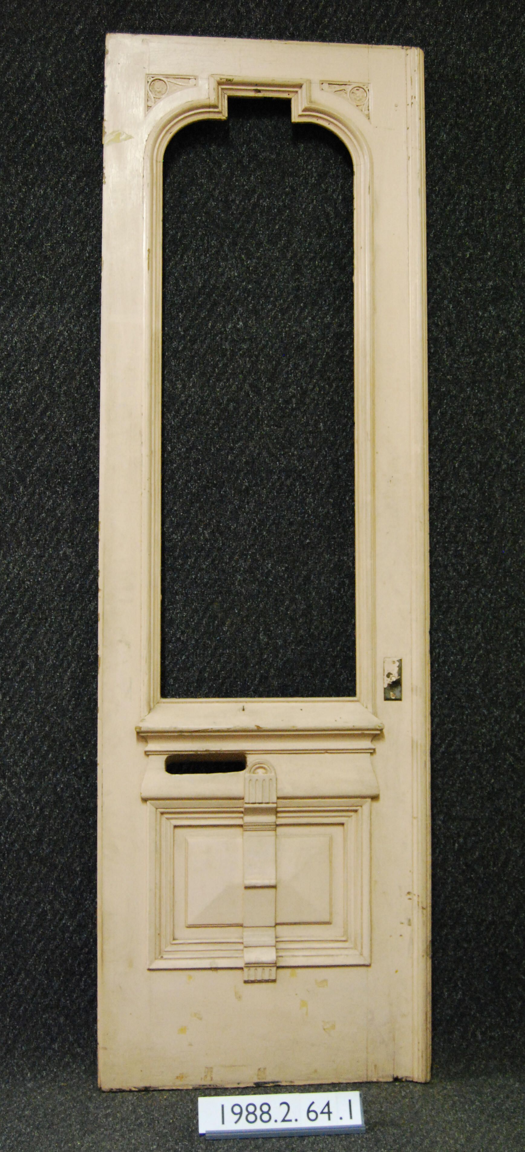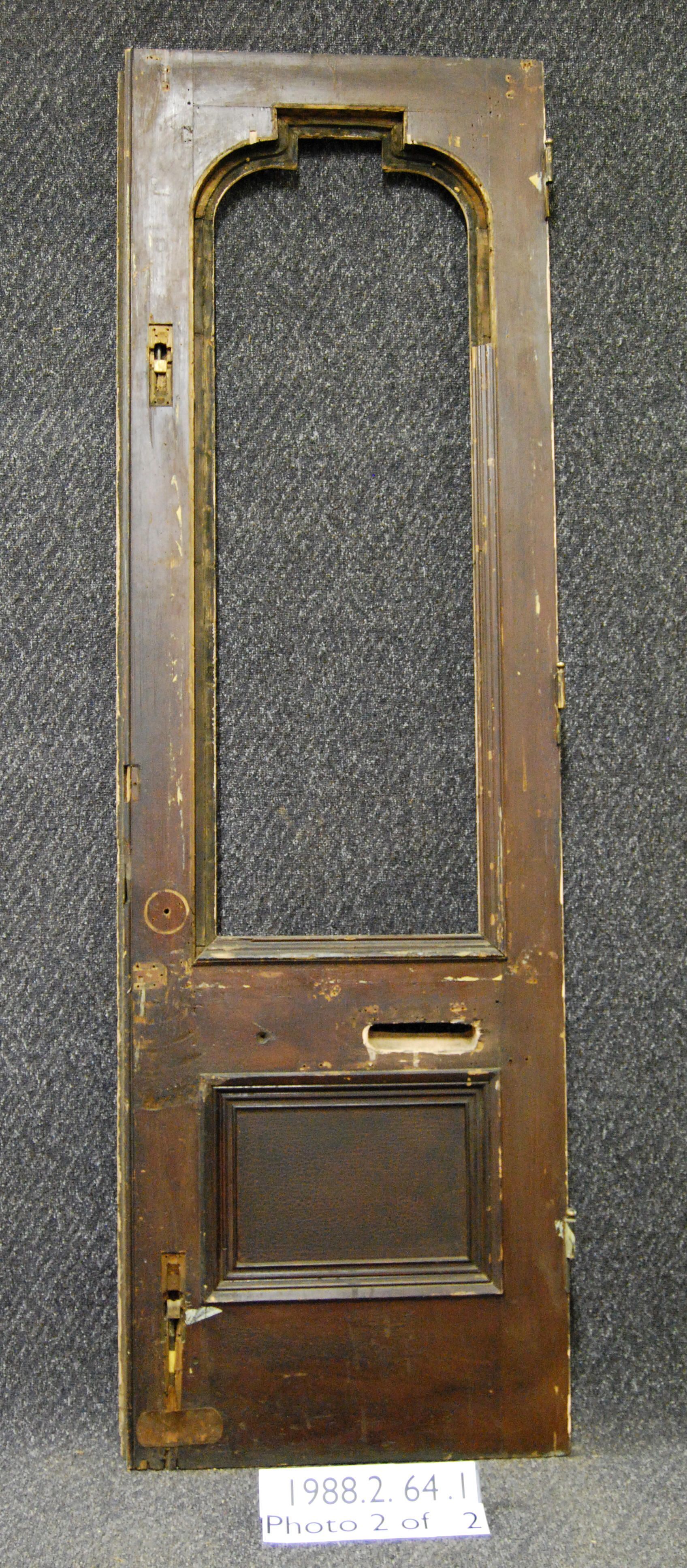 Exterior door. Single panel. Applied moldings and applied ornamentation. Carvings near top. Ornamentation carvings near top. Single opening with arch variation. Glass pane missing. Has astragal molding at edge. Has brass strike plate and incomplete vertical bolts. Has three cast bronze hinge leaves with botanical motif (probably made by Russell Erwin Company). Incomplete door bell. (Has handle). Exterior side is painted pink - interior side is varnished.