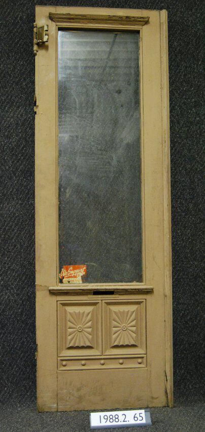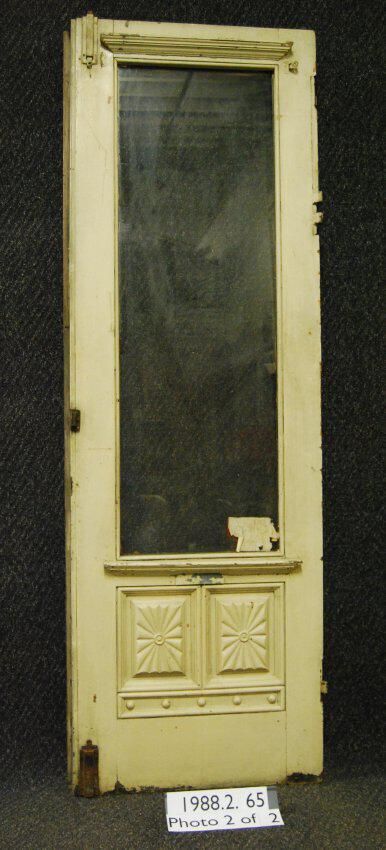 Exterior door. Dual panel with complex carvings and applied moldings on both sides. Has bead ornaments below. Single opening with clear plate glass. Has moldings at top and bottom on both sides. Mail slot cut out. Has two hinge leaves. Upper hinge leaf originally was spring-loaded but now incomplete. Has two later lock strike plates. Astragal molding on edge. Interior has two vertical cast iron bolts. Exterior painted brown - interior painted yellow / tan. Glass pane has decal: "We Support United Good Neighbors."