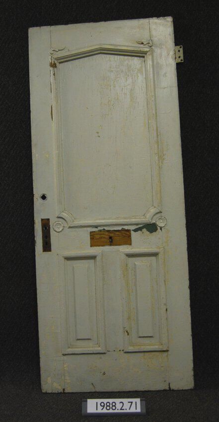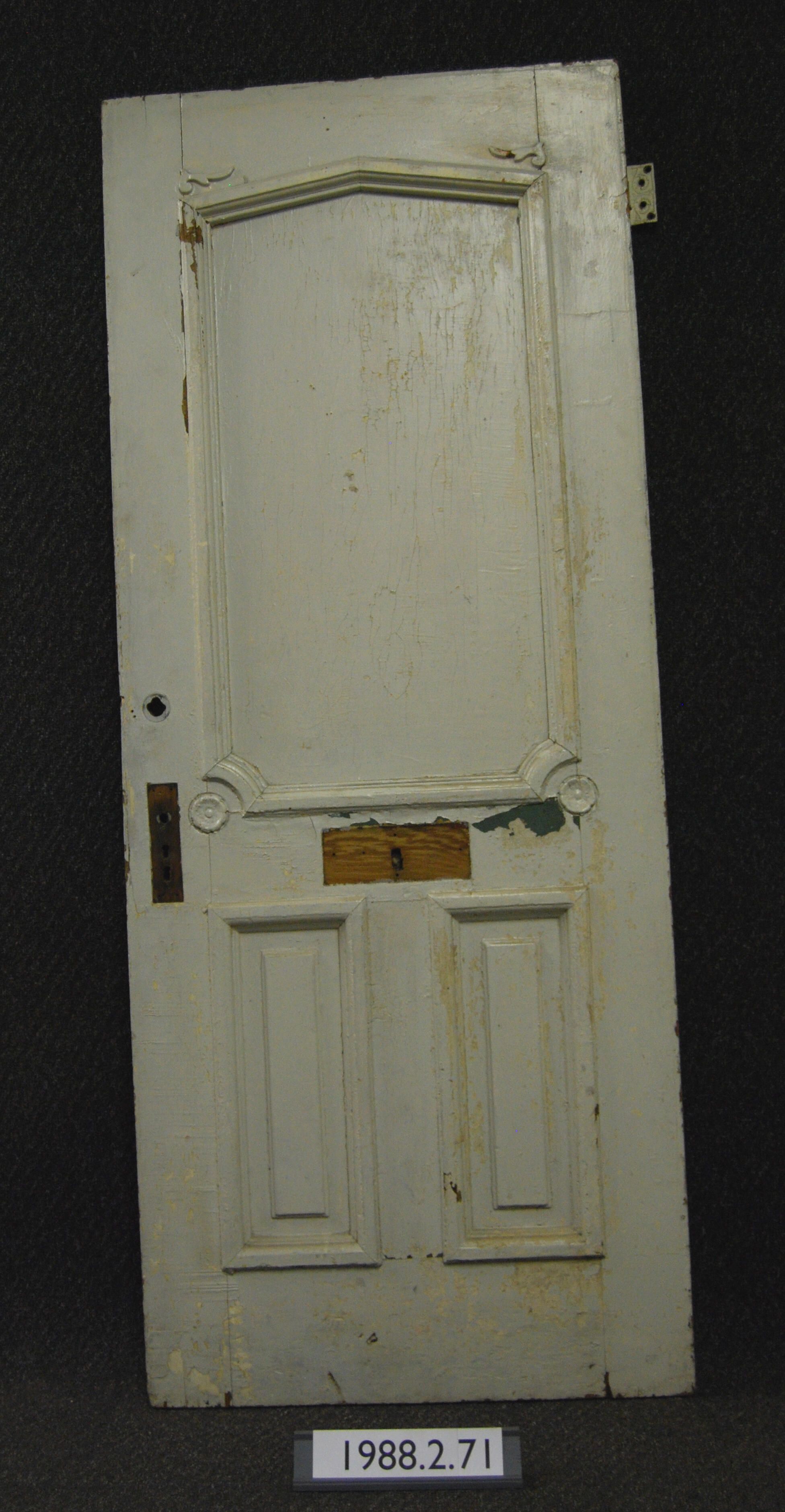 Exterior door. Two panels with applied moldings. Single opening with arch variation. Glass pane is missing - filled with board. Exterior has rosettes and carvings. Mortice lock and escutcheon plates are missing. Has complete hinge and one hinge leaf. Painted white on both sides.