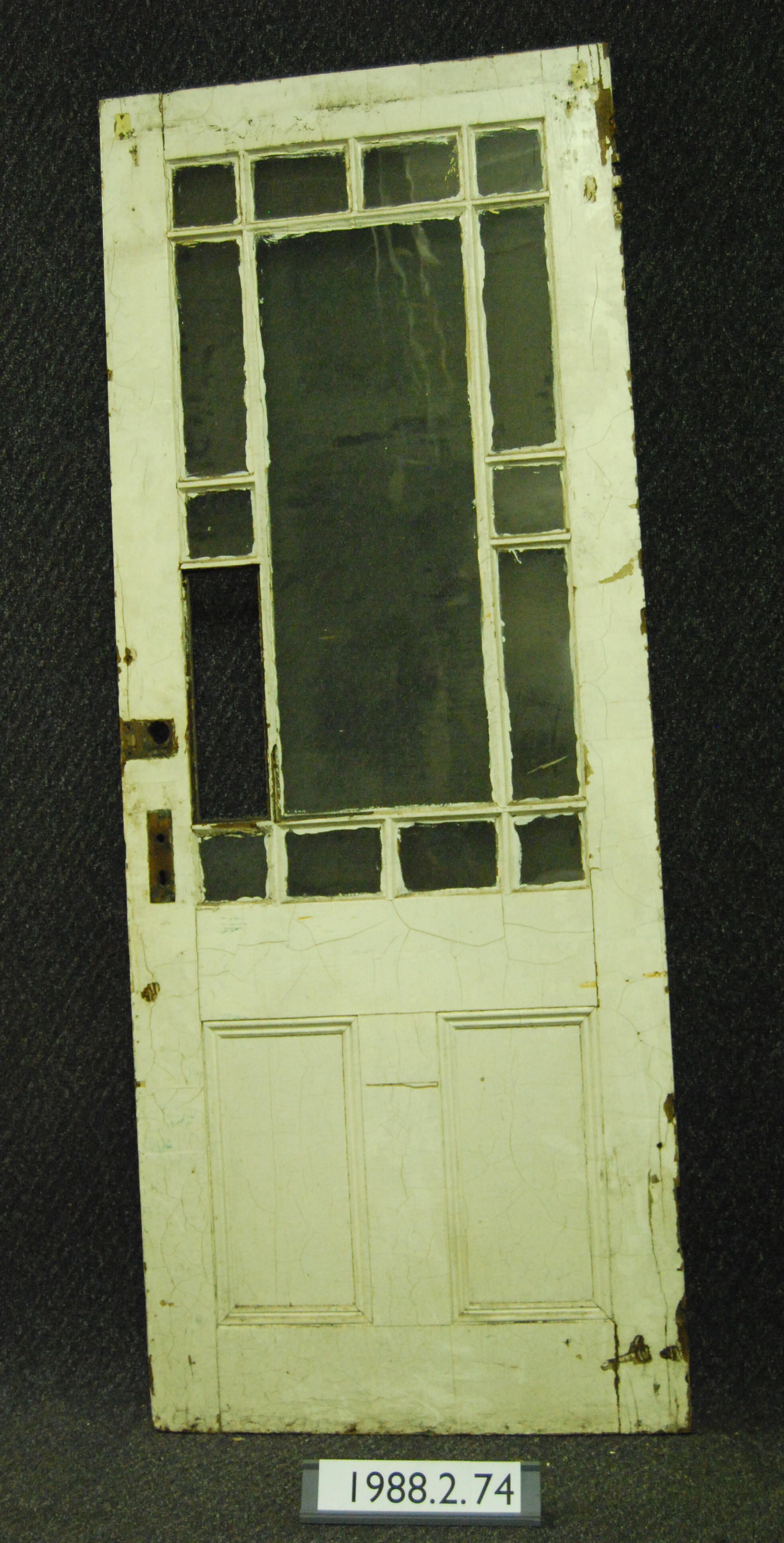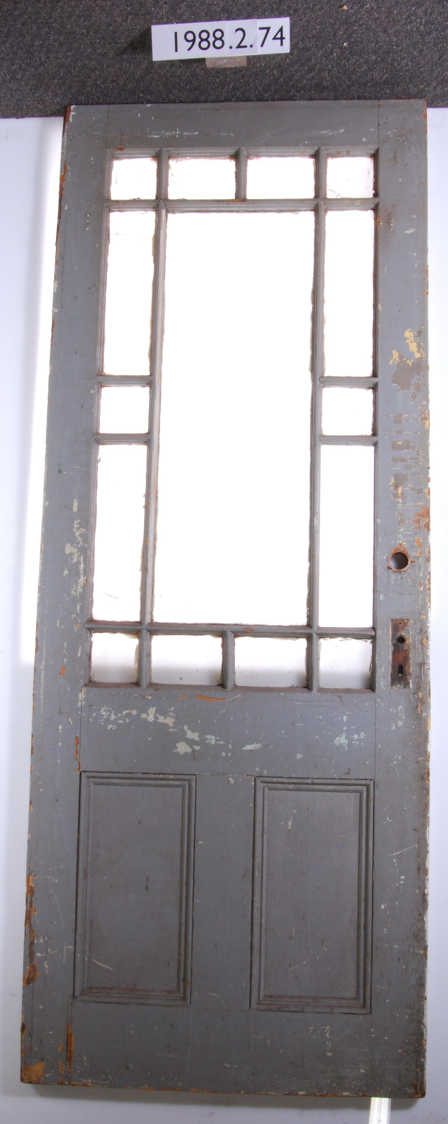 Exterior door. Two panels with applied moldings. Fifteen openings divided by mullions. Fourteen clear glass panes. One pane missing. One hinge leaf. All other hardware missing. Painted grey on exterior - painted white on interior.