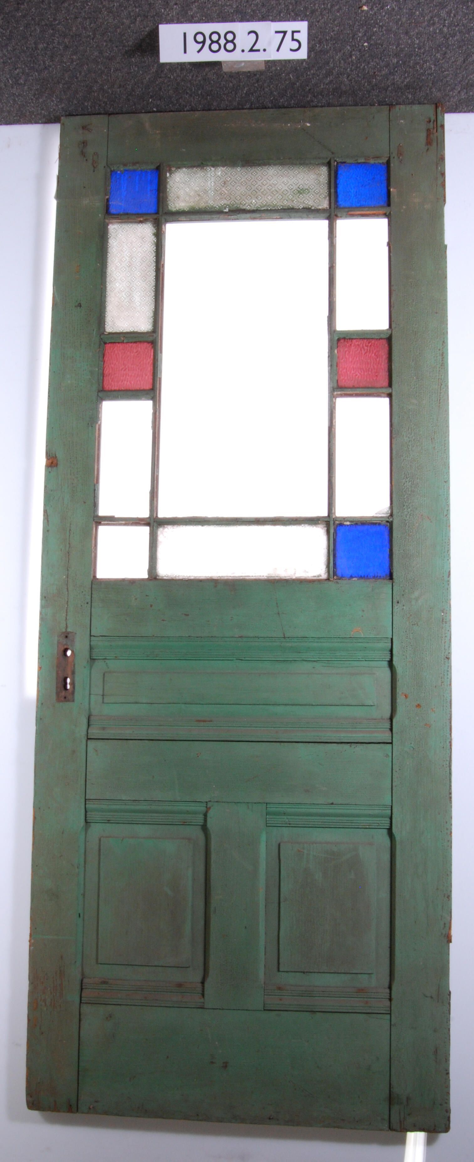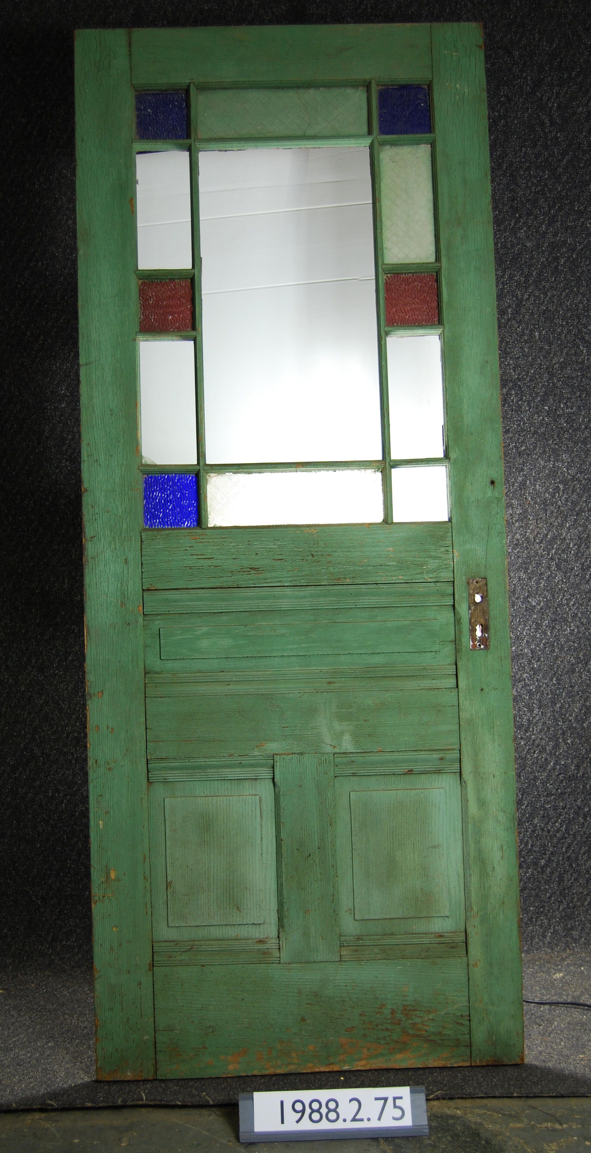 Exterior door. Three panels with applied moldings. Stop chamfered stiles. Thirteen openings divided by mullions. Three blue glass panes machine rolled rippled. Two violet colored. Three molded geometric pattern panes. Five panes missing. All hardware missing. Painted Green on both sides.