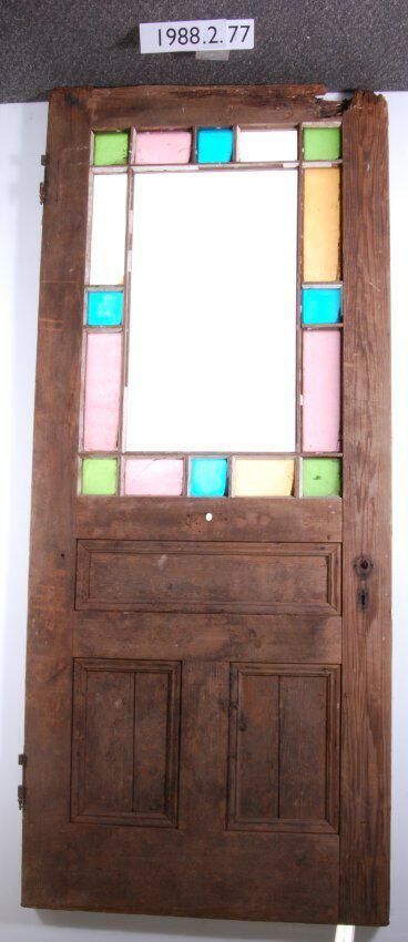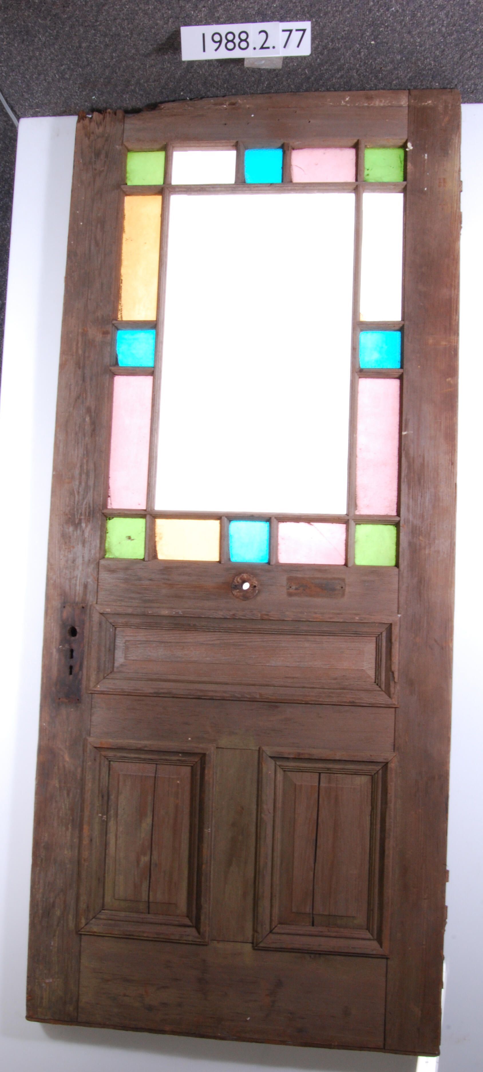 Exterior door. Seventeen openings divided by mullions. Four green; four blue; four violet; and two amber. All molded pattern glass panes. Central pane and two other panes are missing. Has three panels, with applied moldings. Top corner of door has dry rot damage. Has two cast iron hinge leaves. Paint is weathered away on both sides.