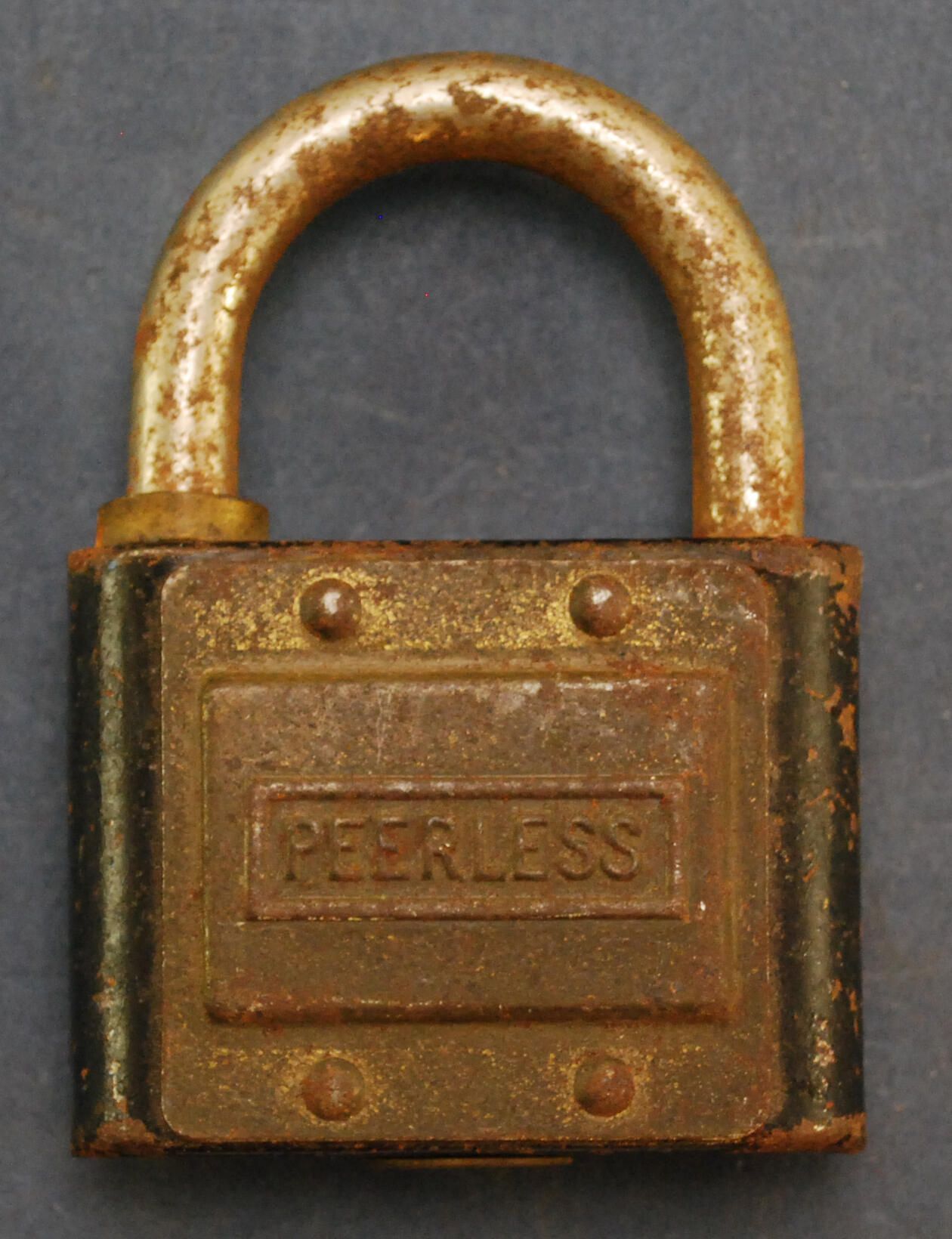 Design Name: Manufacturer: Peerless Style: Material: Steel Manufacturing Method: Cast / Wrought Surface Finish: Japanned VDA Classification: VDA Number: Shape: Patent Specifics: Lock Type (If Applicable): Inscription/Makers Mark: Inscription Text: Comments: Rusty.