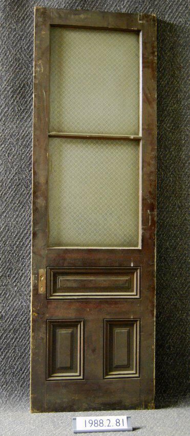 Interior door. Two openings divided by mullions. Two acid-etched clear glass panes with geometric motif. Three panels with applied moldings. All hardware including mortice lock missing. Varnish on both sides. (Possible vestibule door?).