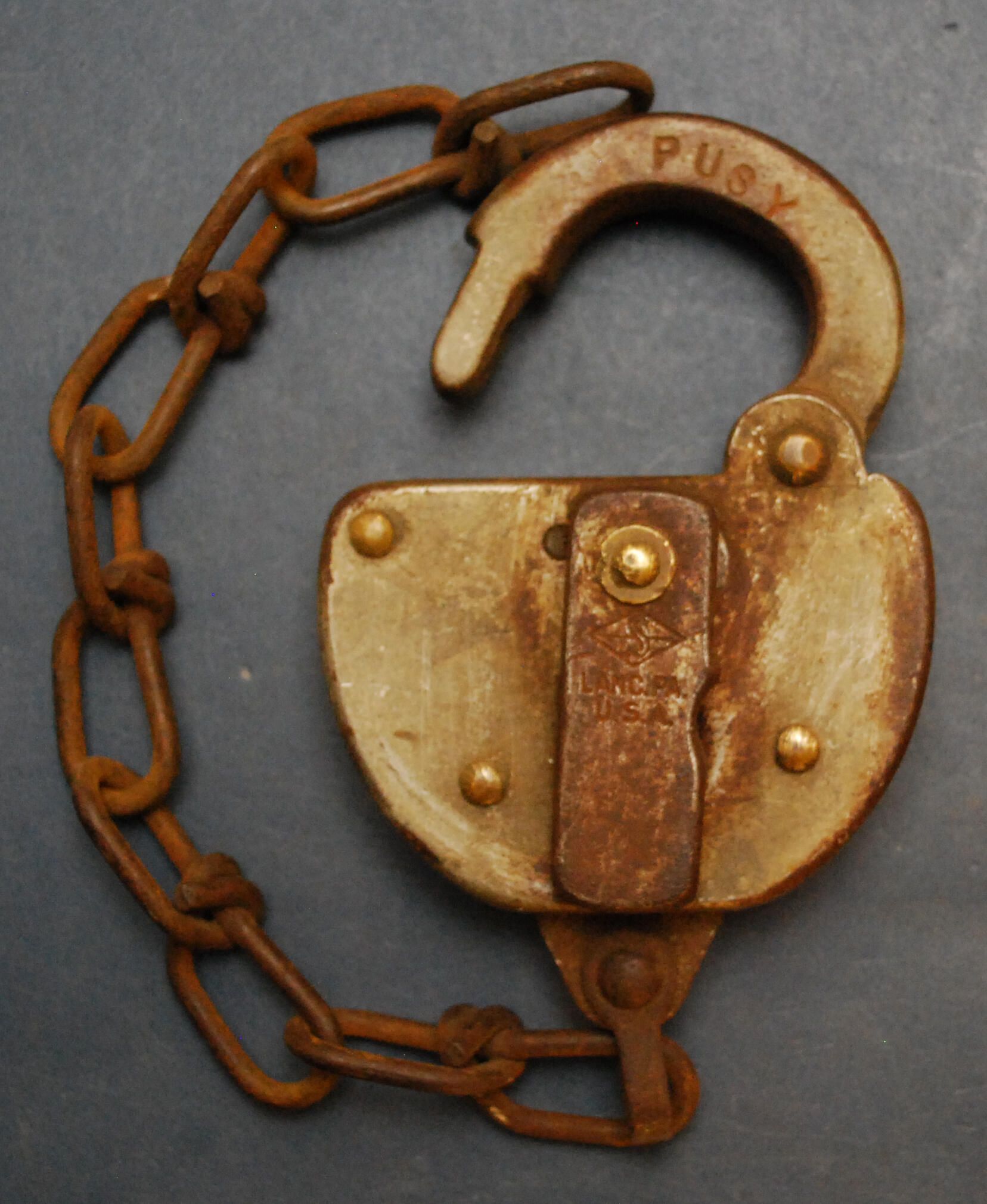Design Name: Manufacturer: S Style: Material: Iron / Steel Manufacturing Method: Wrought / Stamped Surface Finish: VDA Classification: VDA Number: Shape: Patent Specifics: Lock Type (If Applicable): Inscription/Makers Mark: S Inscription Text: P. USY 1949 Comments: Probably railroad padlock, has chain.