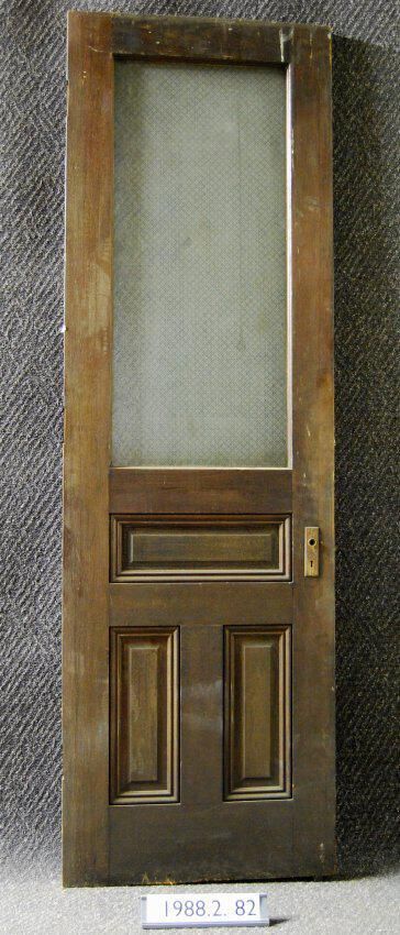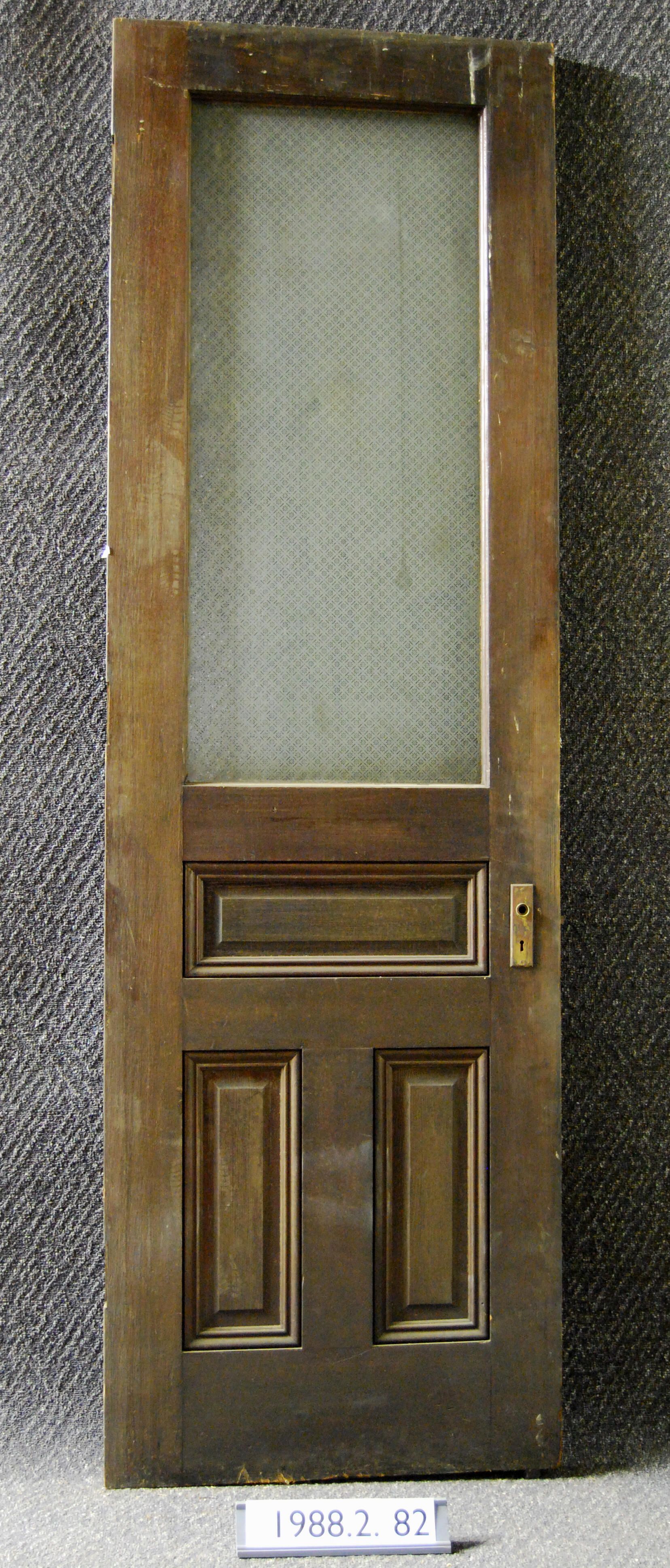 Interior door. Single opening with acid-etched clear glass pane with geometric motif. Door has three panels with applied moldings. Has mortice lock. Two brass escutcheon plates. Hinges are missing. Varnished on both sides. (Possible vestibule door?).