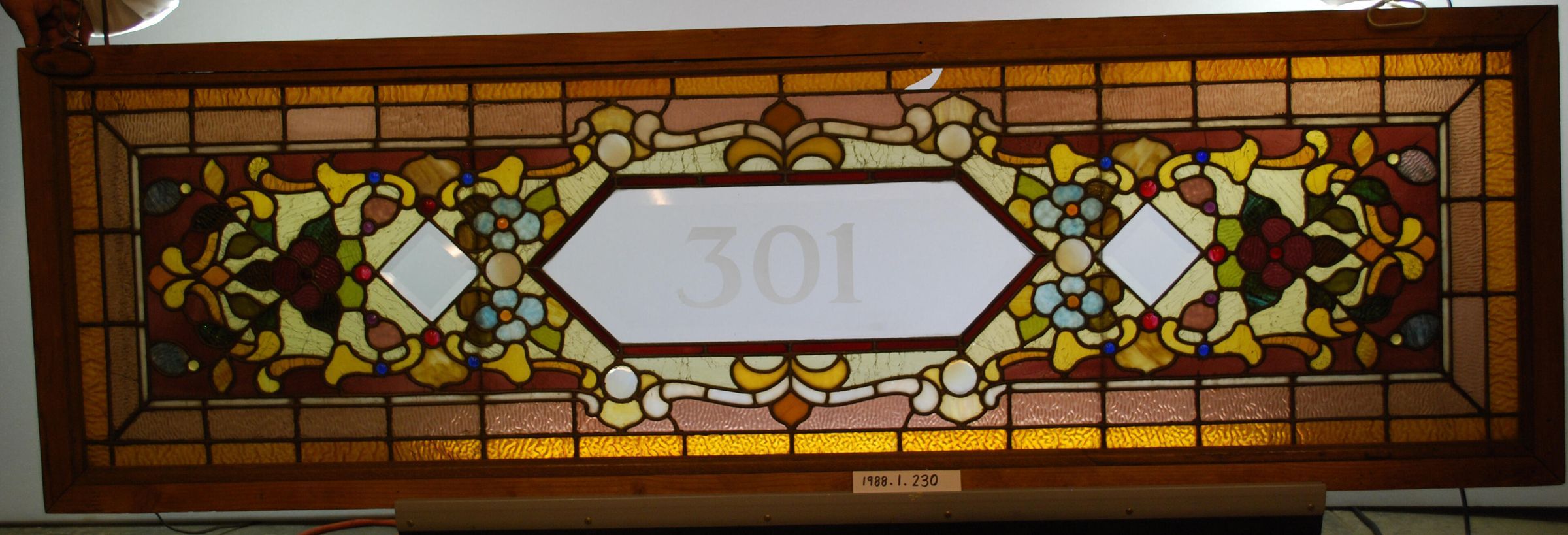 Transom window, machine/hand rolled rippled glass, opalescent, glue-chip, round jewels, faceted jewels, cathedral, clear beveled, and wheel etched glass. With dogwood floral motif, Sash is modern replacement.Lexicon