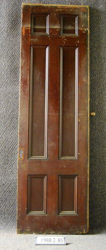 Interior sliding pocket door. Six panel,("cross and bible") with applied moldings. Handles and latch are missing. Has groove at bottom edge. Has dowel stop at back edge. Has iron hanger hardware at top edge. Varnished on both sides.