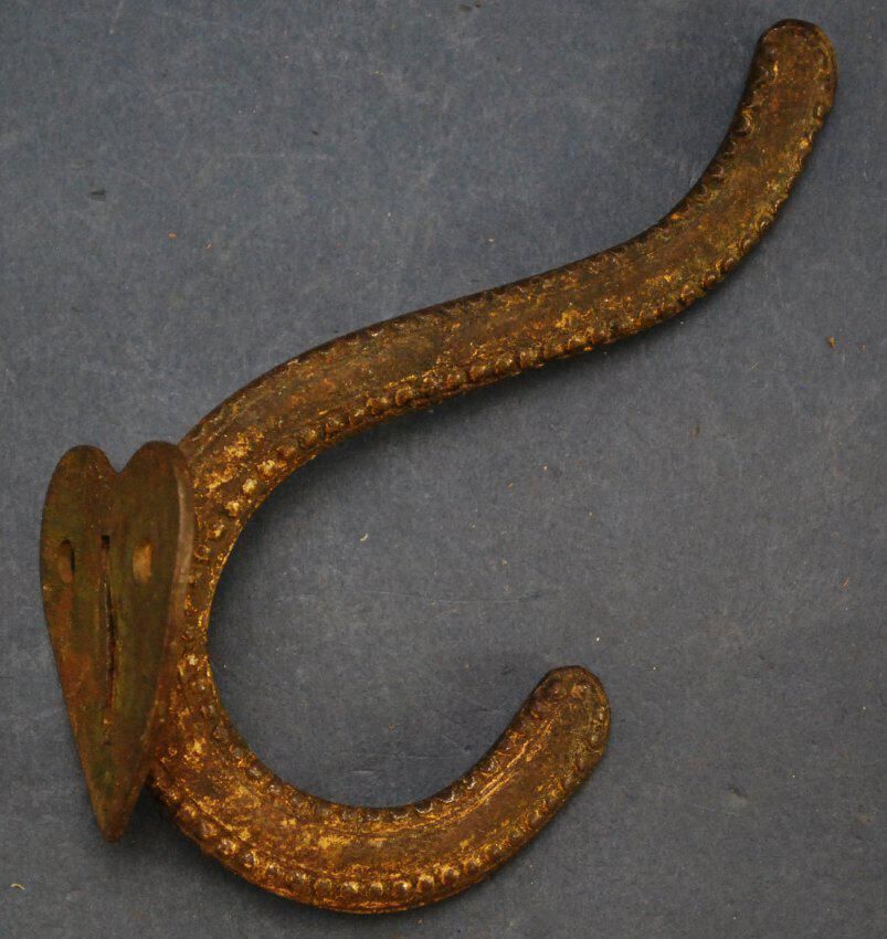 Design Name: Manufacturer: Unknown Style: Material: Steel Manufacturing Method: Wrought / Stamped Surface Finish: Plated VDA Classification: VDA Number: Shape: Patent Specifics: Lock Type (If Applicable): Inscription/Makers Mark: Inscription Text: Comments: Remnants of gold colored paint. Hook is bent.
