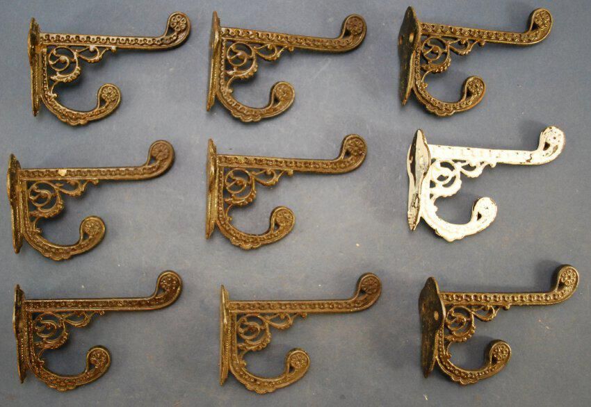 Design Name: Manufacturer: Unknown Style: Eastlake Material: Iron Manufacturing Method: Cast Surface Finish: Original laquer VDA Classification: VDA Number: Shape: Patent Specifics: Lock Type (If Applicable): Inscription/Makers Mark: Inscription Text: Comments: Over / under double hook. One has after market paint.