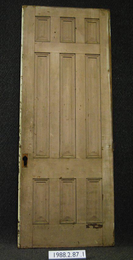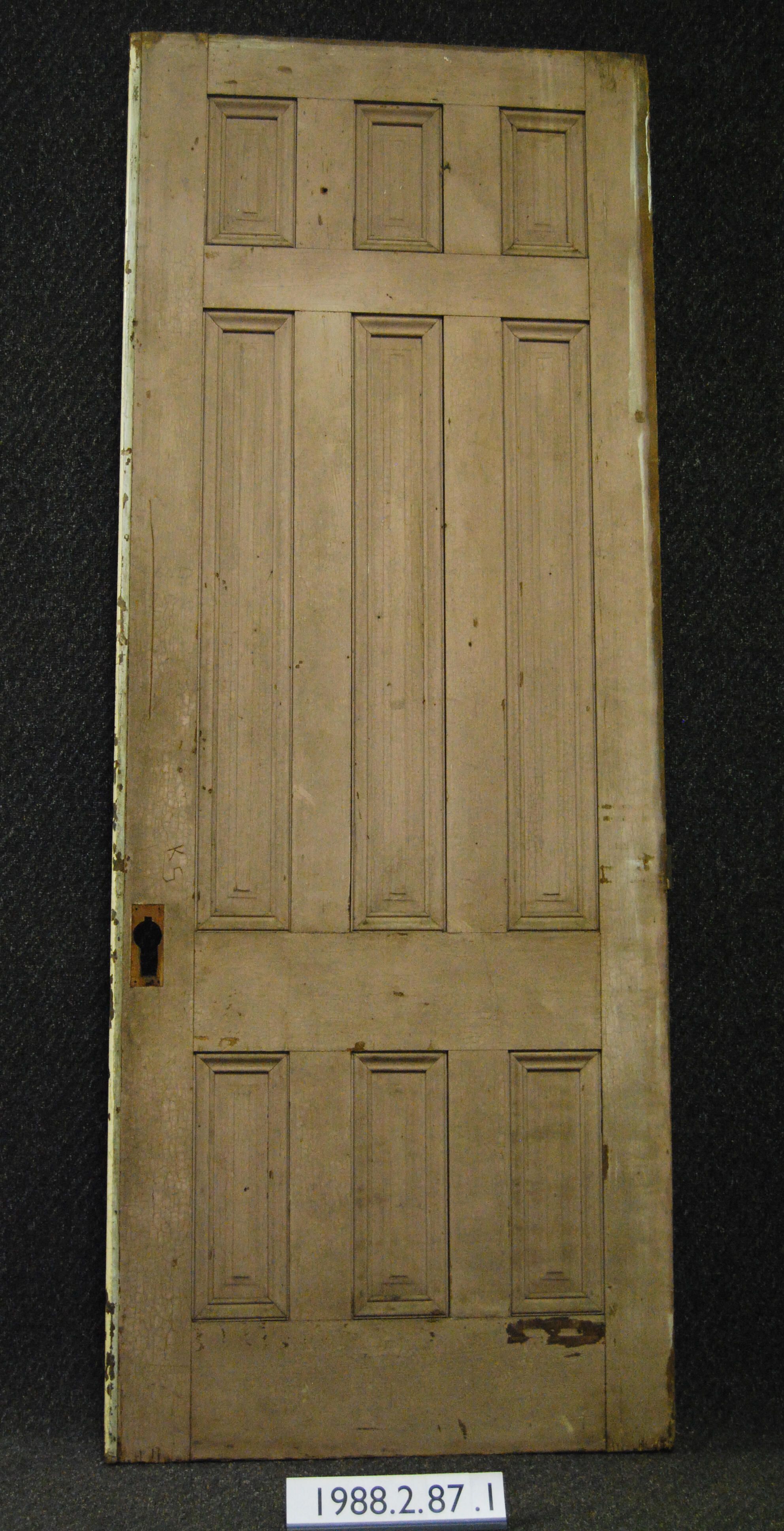 Interior sliding pocket door. Nine panel with applied moldings. Handles and latch are missing. Painted dusty rose / reddish brown. Has iron hardware on edge.