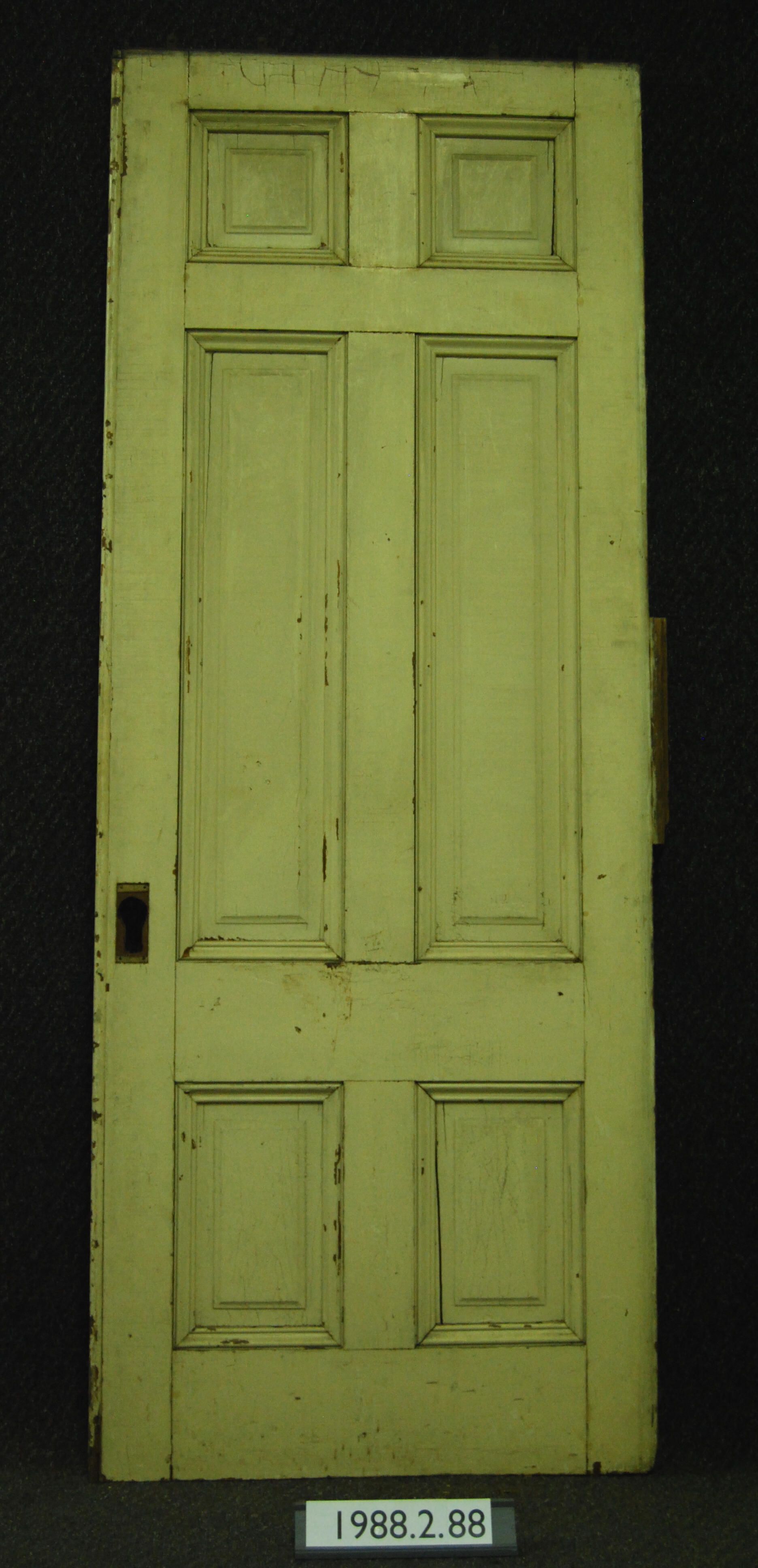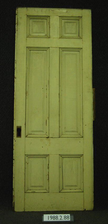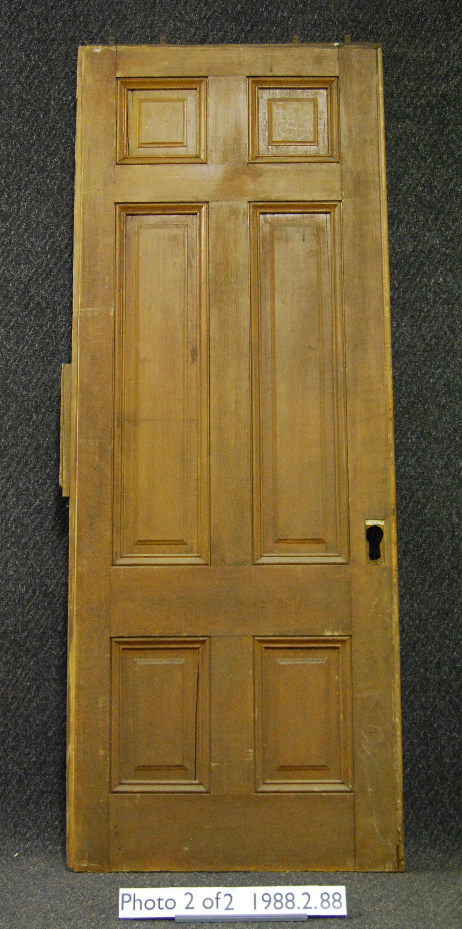 Interior sliding pocket door. Six panel ("cross and bible") with applied moldings. Handles and latch are missing. One side faux wood grained - other side is painted yellow / cream colored. Has iron hanger hardware at top. Wood cleat stop on edge.