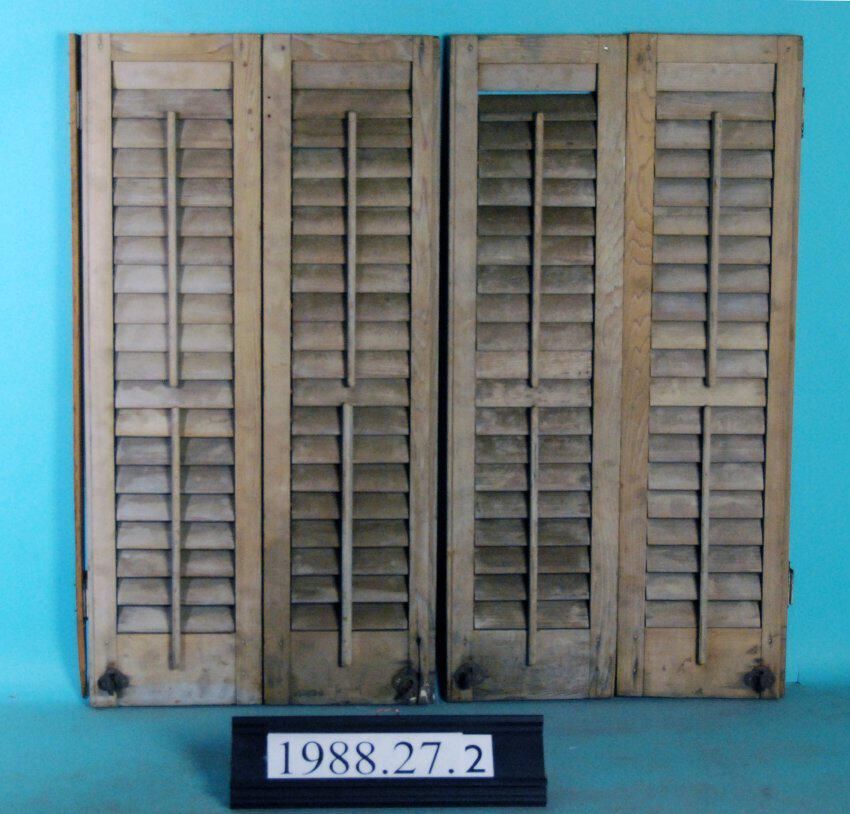 One lot of two exterior louvered pairs of shutters. Each composed of two leaves. Hinging has been modified. Each pair has two latches. Finish has been stripped. Finish: Stripped. Material: wood