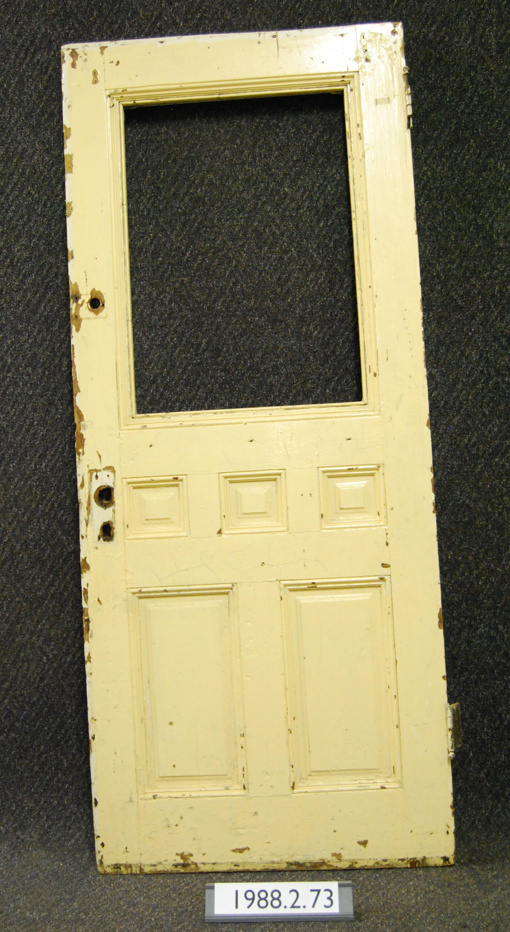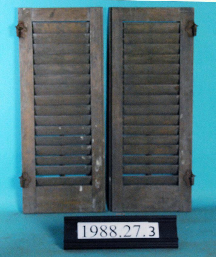 One pair of exterior louvered shutters. Each has cast iron hinge pintle and latch. Finish has been stripped. Finish: Stripped. Material: wood