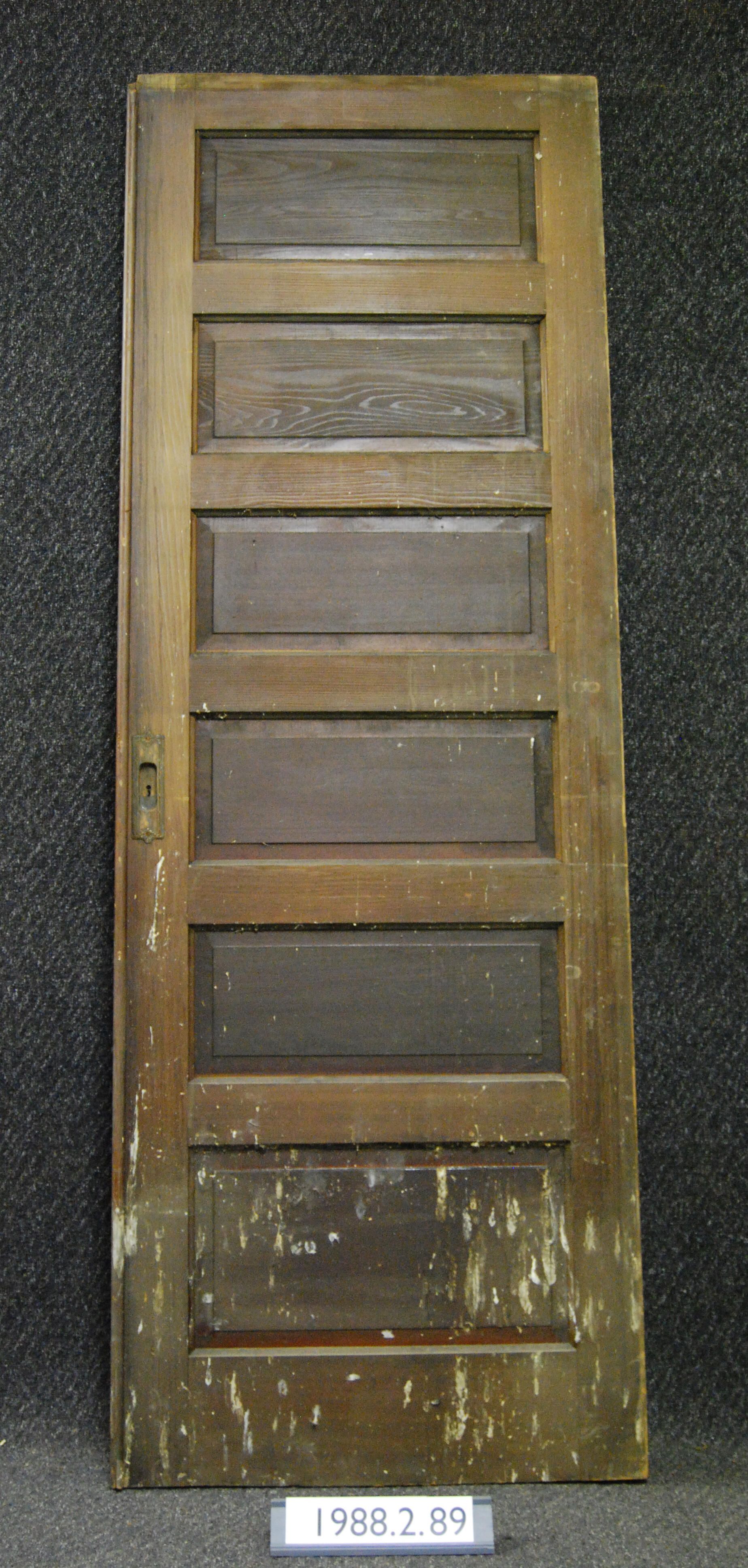 Interior sliding pocket door. Six horizontal panels. Has recessed handles and mortice lock. Varnished on both sides. Inscriptions or Markings: Manufacturer: Place of Manufacturer: Design Motif: Style: Finish: Varnished