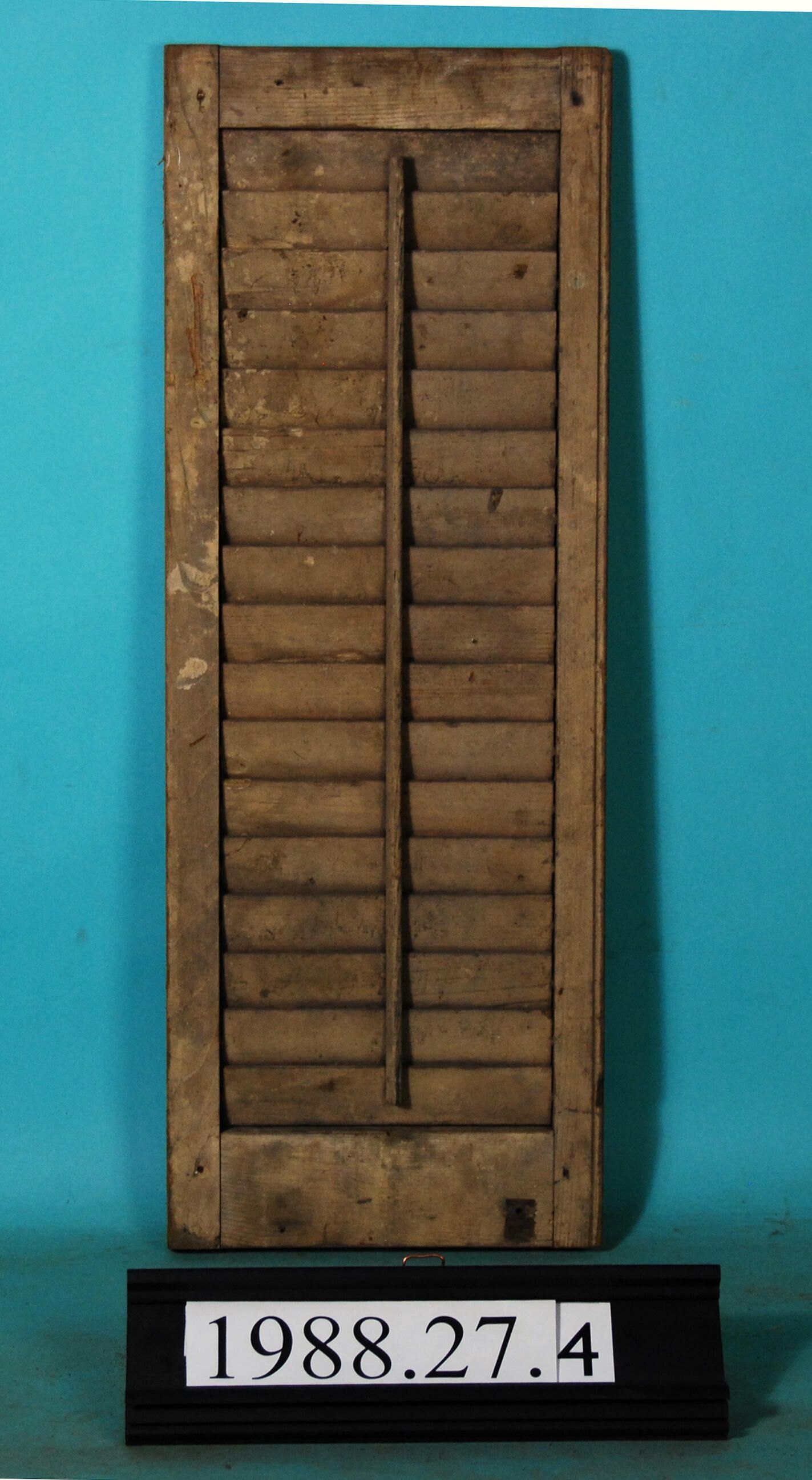 One exterior louvered shutter. All hardware missing. Finish composed of remnants of white paint. Finish: remnants of white paint. Material: wood