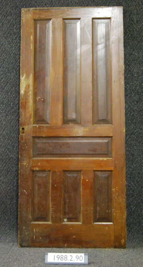 Interior sliding pocket door. Seven panel. Handle is missing. Varnished on both sides. Inscriptions or Markings: Manufacturer: Place of Manufacturer: Design Motif: Style: Finish: Varnished