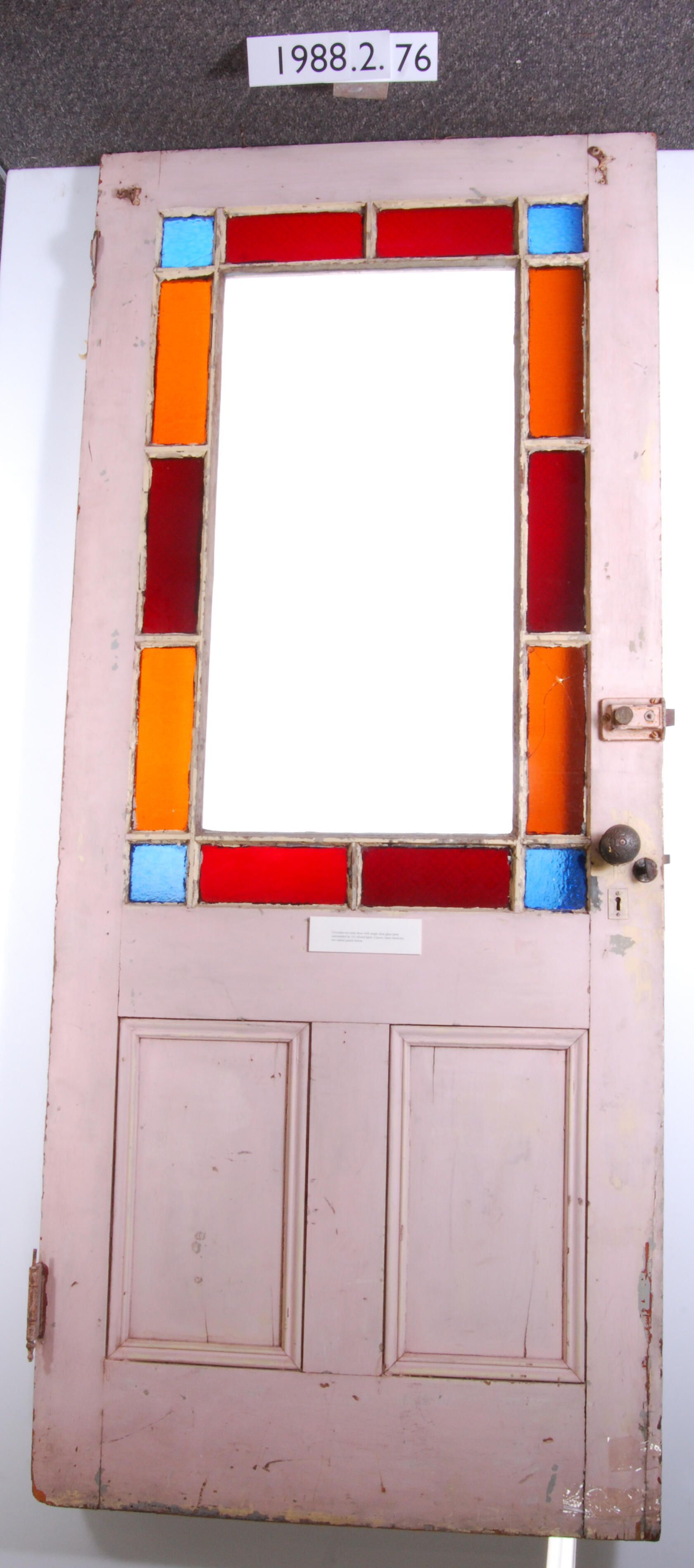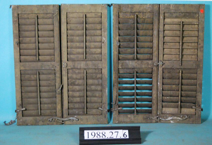 One lot of two pairs of exterior louvered shutters. Cast iron hinges (one is dettached), and double latches (only one with hook). Finish is faded sage paint.