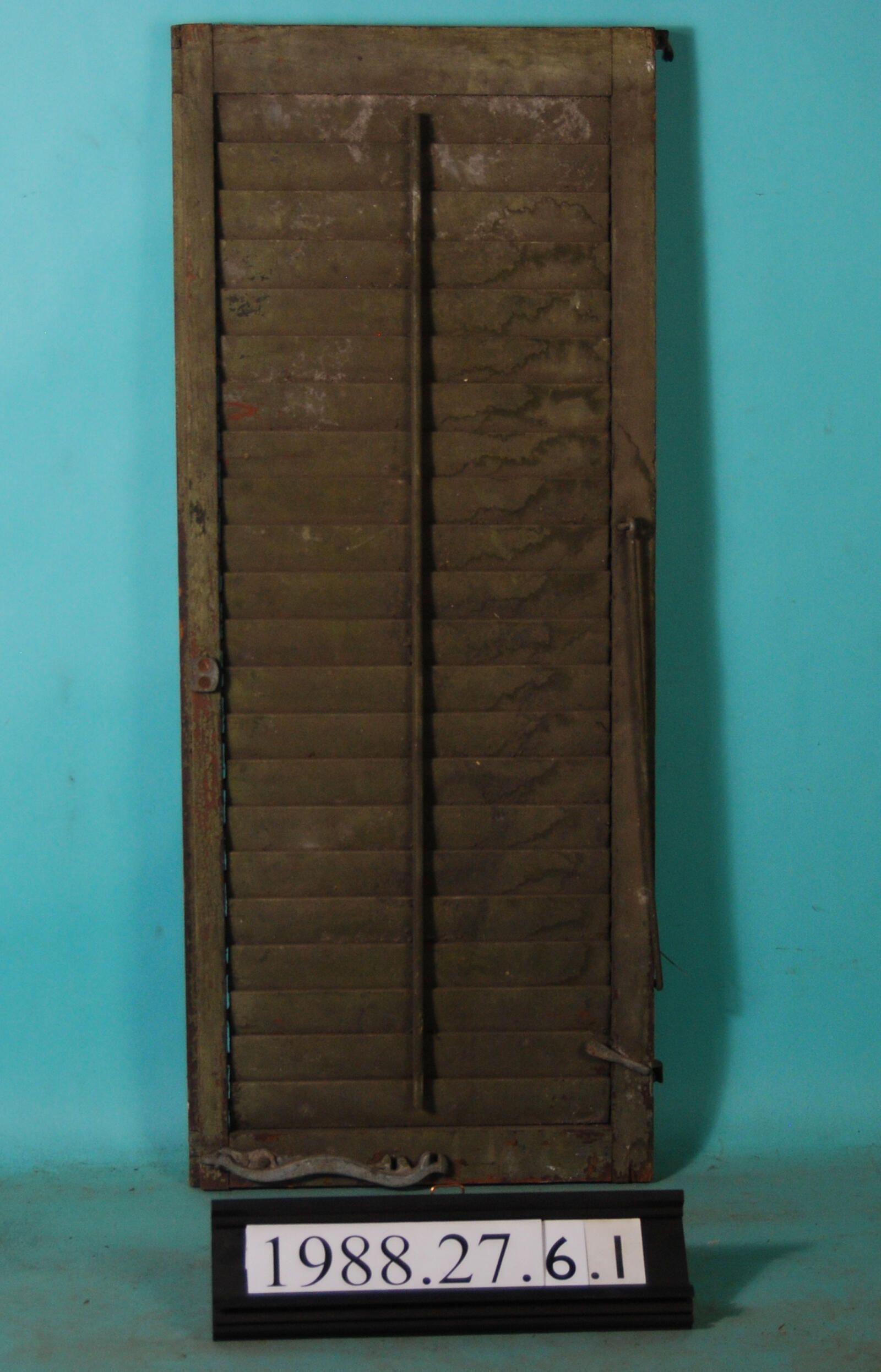 One exterior louvered shutter. Cast iron hinges and double latches with hook. Finish is faded sage paint. Finish: faded sage paint Material: wood