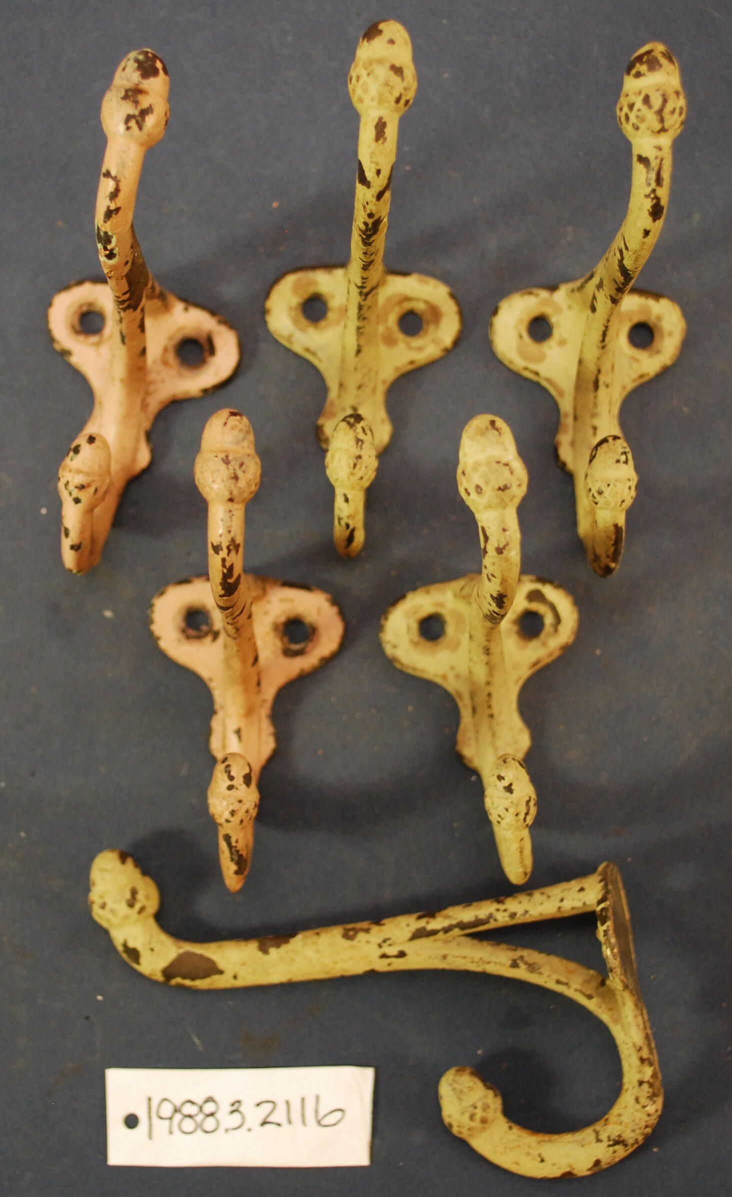 Design Name: Manufacturer: Unknown Style: Material: Iron Manufacturing Method: Cast Surface Finish: Plated, Brass / Painted VDA Classification: VDA Number: Shape: Patent Specifics: Lock Type (If Applicable): Inscription/Makers Mark: Inscription Text: Comments: Crosshatching on acorn design, later painted.