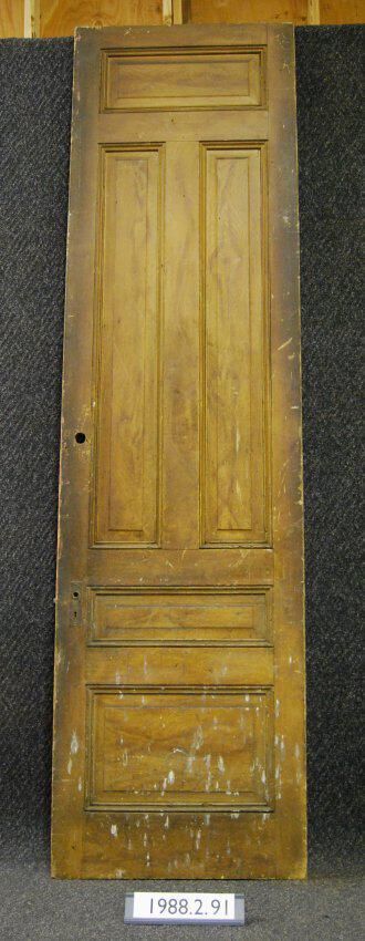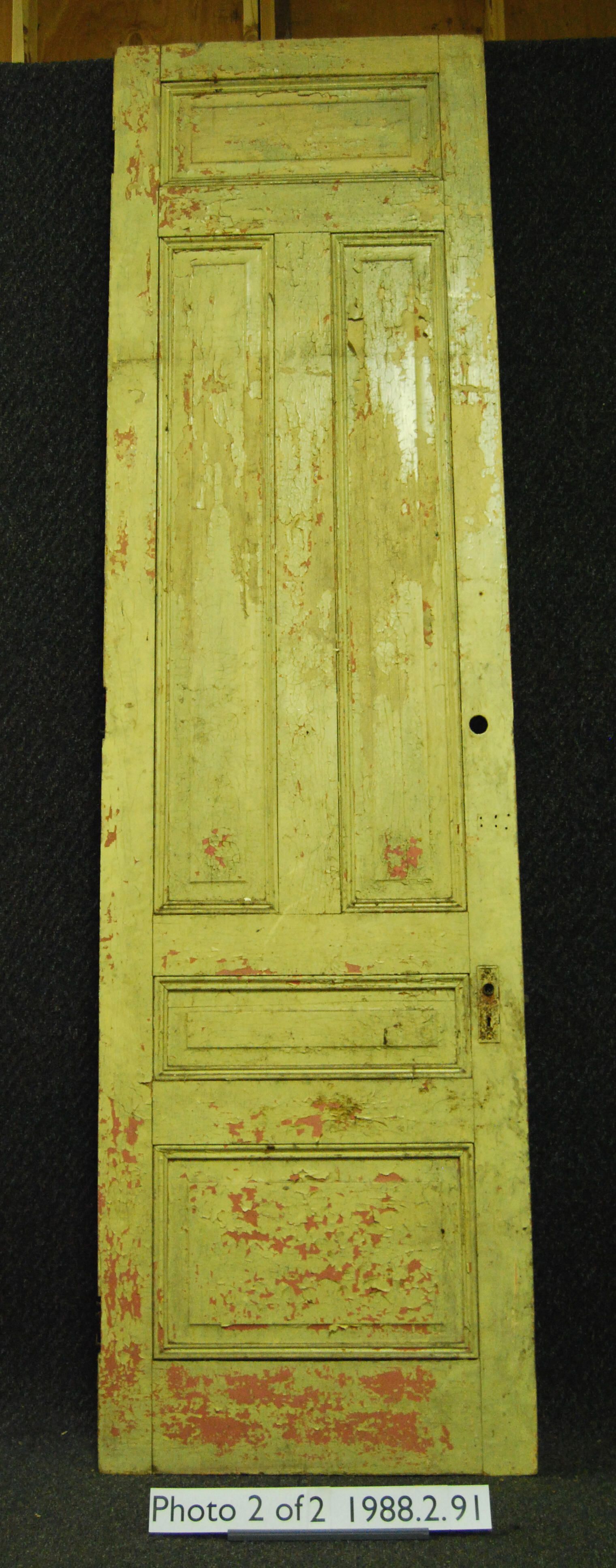 Interior door. Five panel with applied moldings. Has mortice lock. Cast iron back plates. Hinges are missing. Faux wood grained on one side - other side is painted (peeling) cream colored over orange colored.
