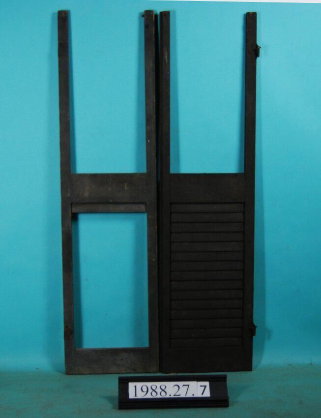 One pair exterior louvered shutteres. One leaf has cast iron hinge pintle, other has two pintles. Both are truncated at top , and missing louvers. Finish is dark gray paint.
