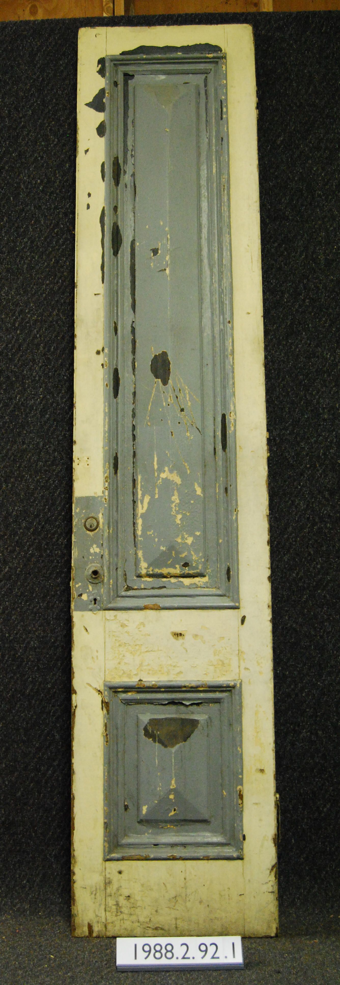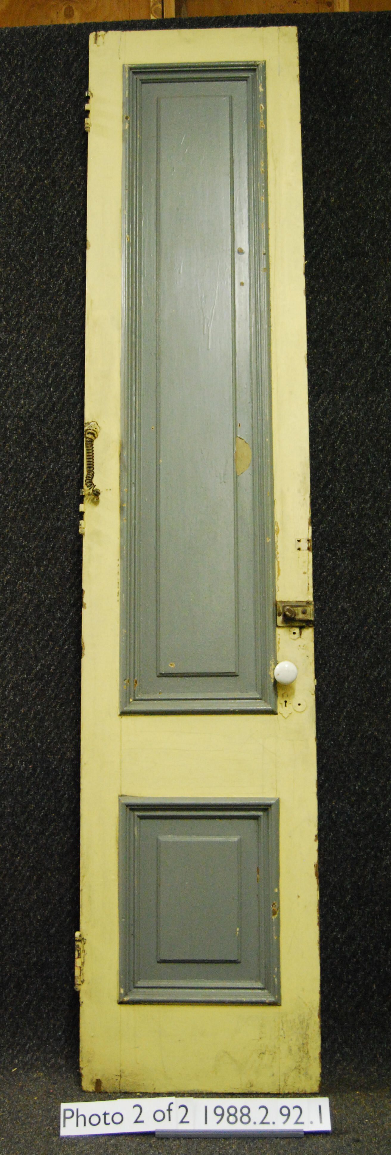 Exterior door. Two panel. Has mortice lock. Cast iron back plates. One white porcelain door knob. Two iron key hole escutcheon plates. One complete hinge. Two hinge leaves. Broken spring at hinge edge. Later cylinder lock. Painted grey and cream / yellow on both sides.