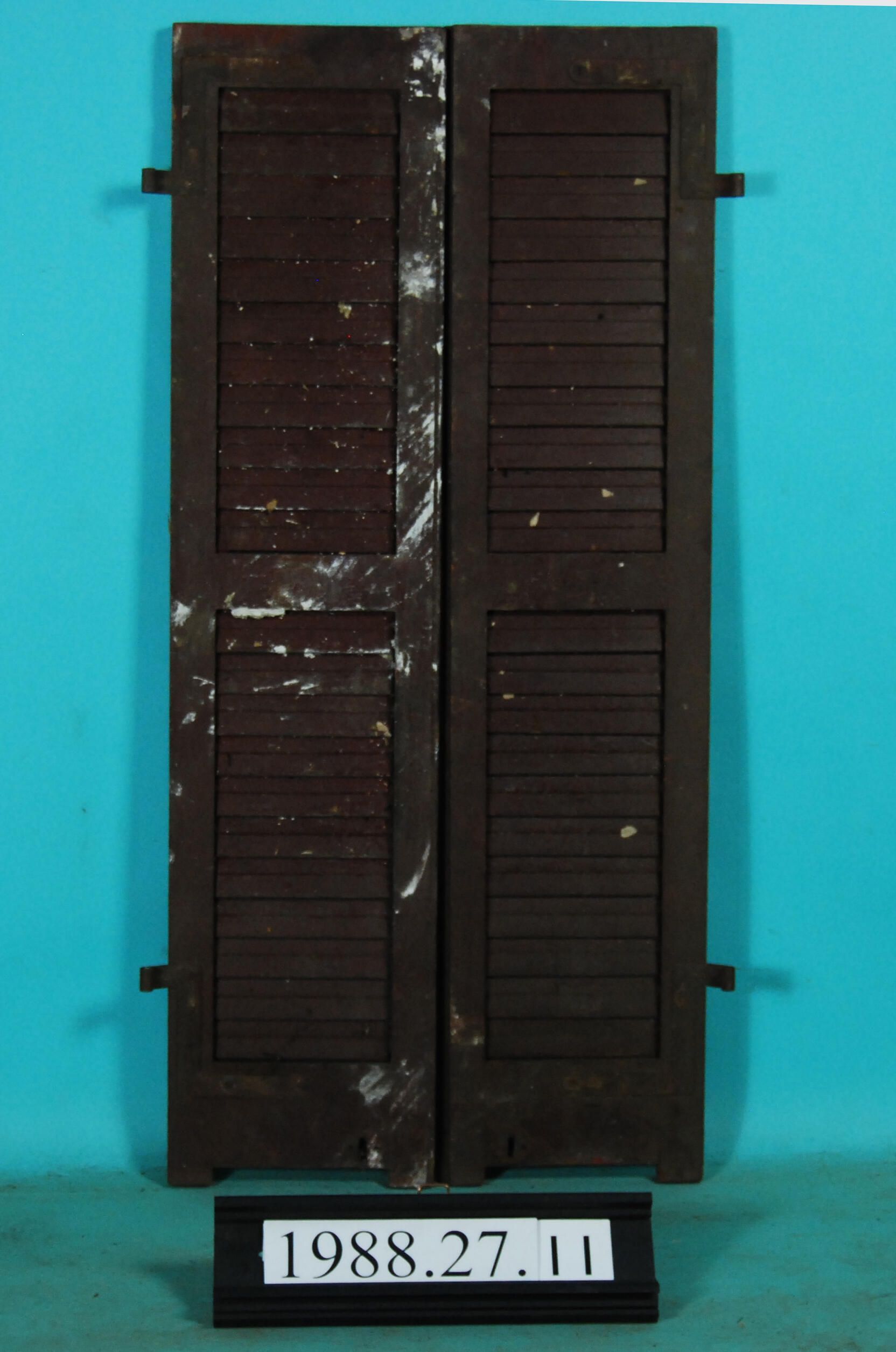 One pair of exterior louvered shutters.Has L-hinges, one leaf has latch, other is incomplete. Finish is red paint / varnish Finish: red paint / varnish Material: wood