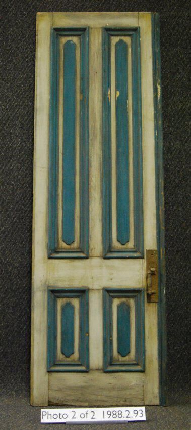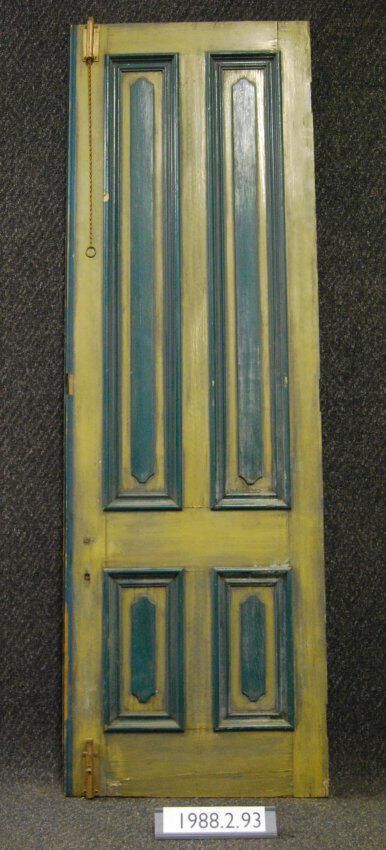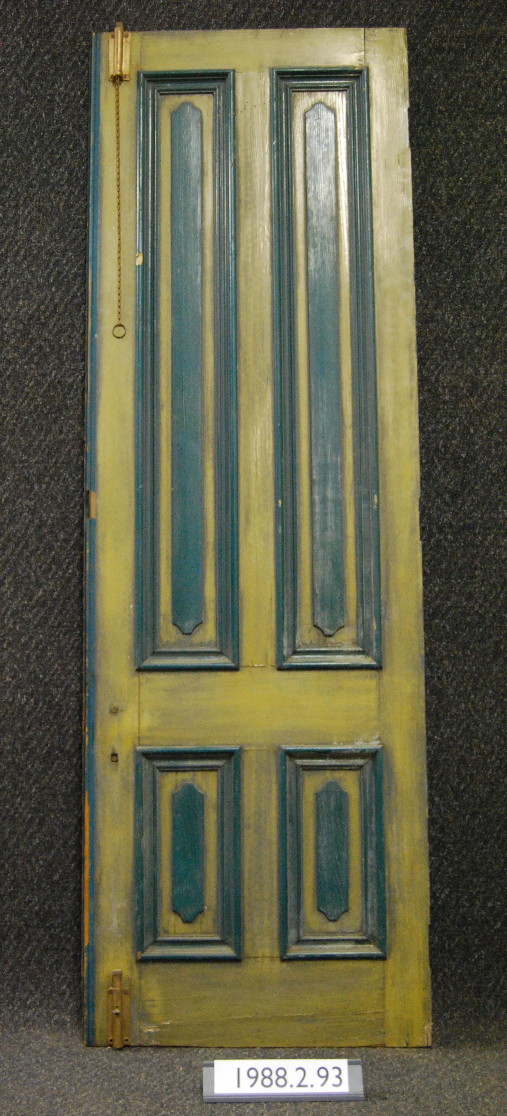 Exterior door. Modern reproduction of Victorian-style. Has four panels with applied moldings. Panels formed from plywood. Has historic period cast iron door handle. Thumb latch and escutcheon plate. Has lock strike plate. Hinges are missing. Painted green / antique faux finish.