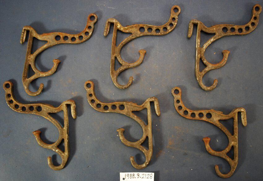 Design Name: Manufacturer: Unknown Style: Material: Iron Manufacturing Method: Cast Surface Finish: Plated VDA Classification: VDA Number: Shape: Patent Specifics: Lock Type (If Applicable): Inscription/Makers Mark: Inscription Text: Comments: Originally slipped over a board and used as a set with a rod through the holes at the tips.