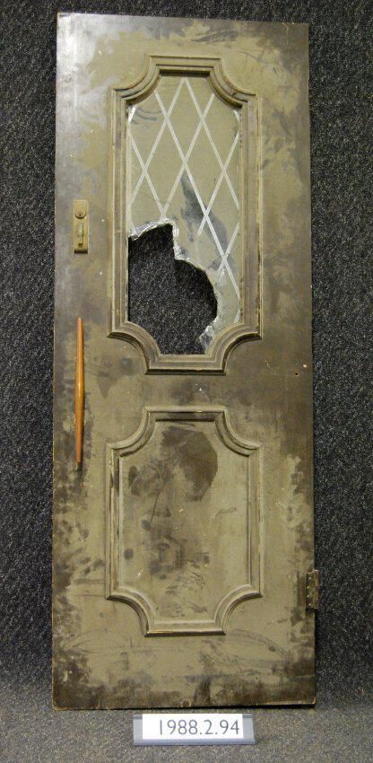 Exterior commercial door. Single opening. Clear broken glass (with alarm strips). Single flush panel. Applied moldings surround both panel and opening. Has cylinder lock. "T" handle and brass or bronze exterior handle. Has one complete hinge. Other two hinges are missing. Originally has "Crash" bar - now missing. Door is varnished on both sides.