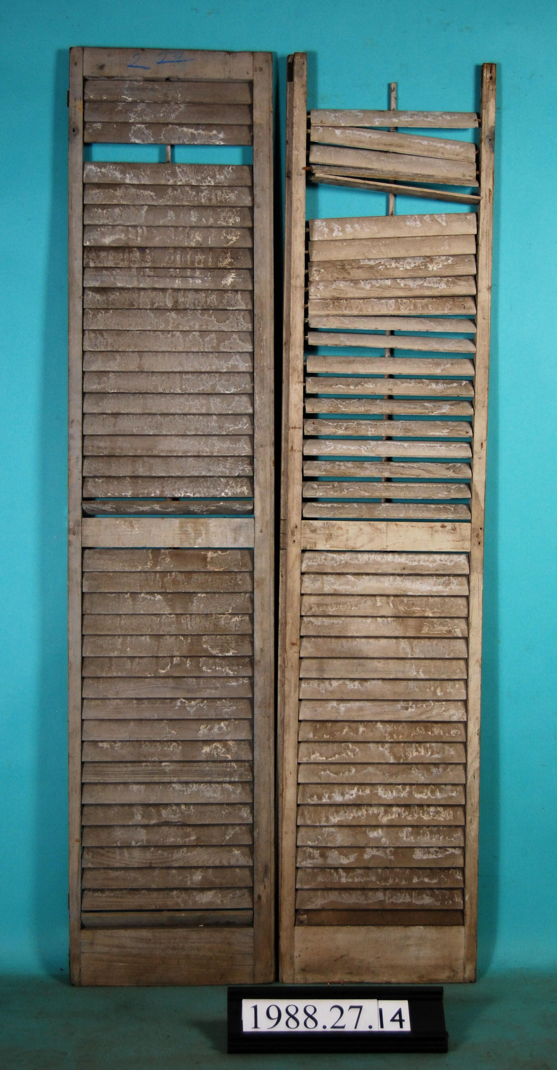 One pair exterior louvered shutters. One shutter has two hinge leaves, other only has one. Finish has been stripped. Finish: stripped Material: wood