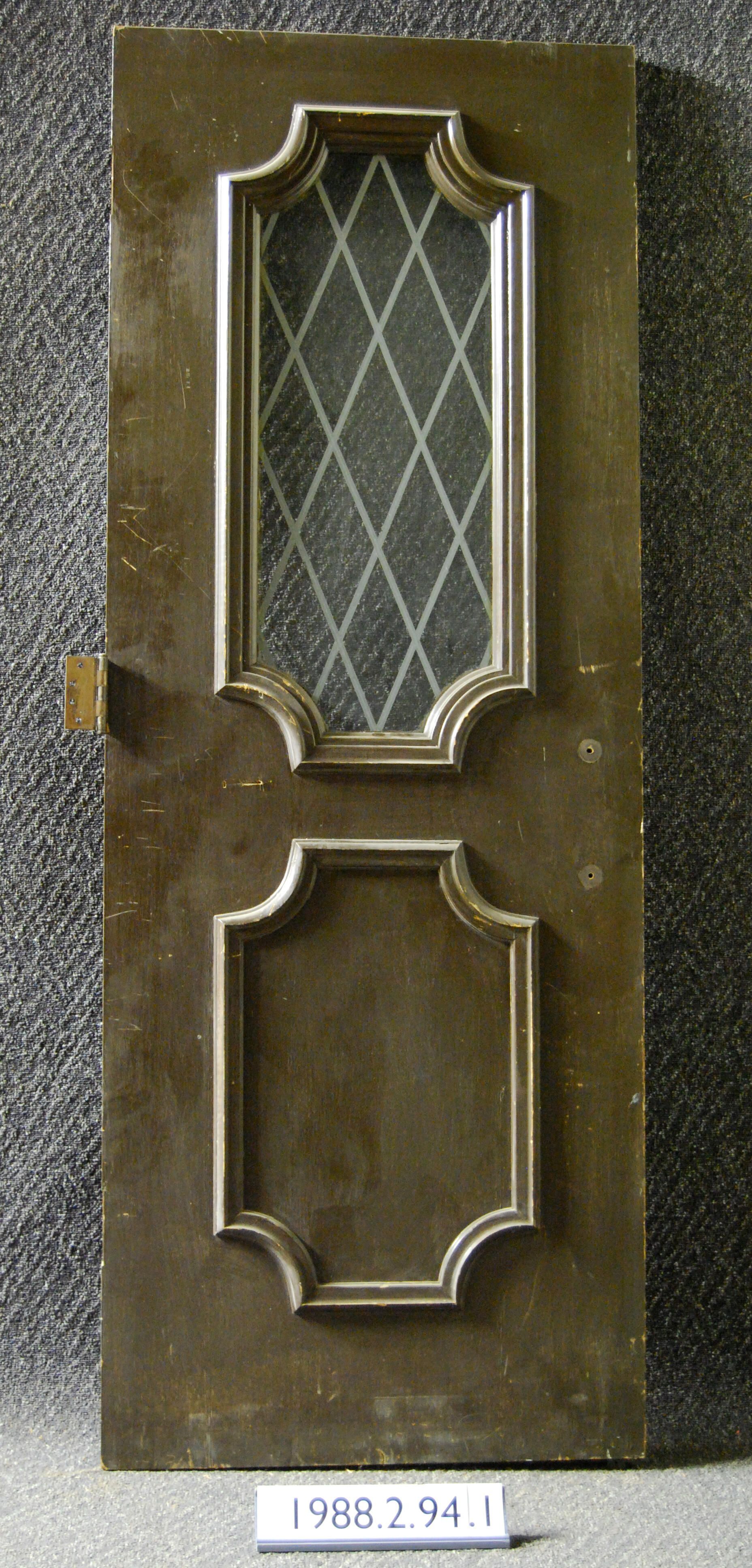 Exterior commercial door. Single opening. Clear glass pane (with alarm strips). Single ffush panel. Applied moldings surround both panel and opening. Door is veneered. Solid core. Has one hinge. All other hardware is missing. Varnished on both sides.
