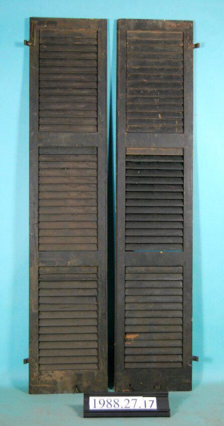 One pair exterior louvered shutters. All L-hinges, full latch. One broken louver. Finish is dark gray paint. Finish: dark gray paint Material: wood