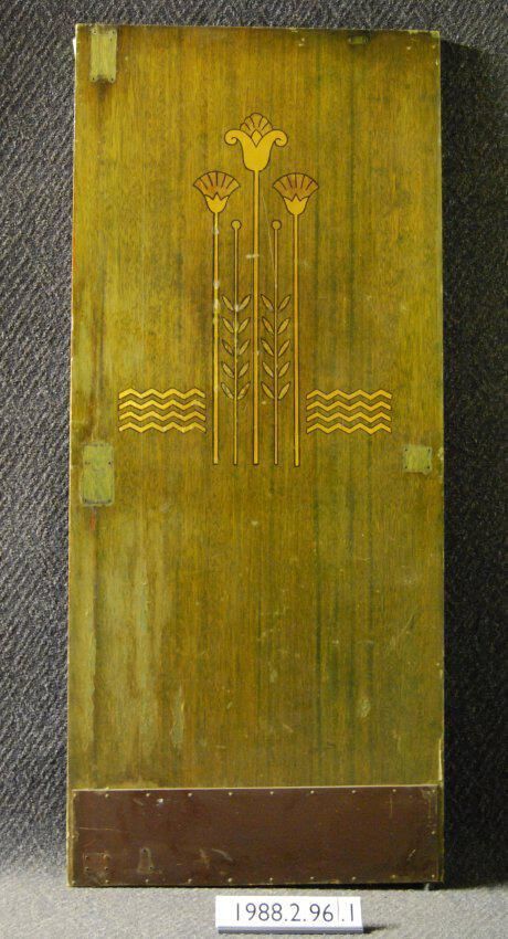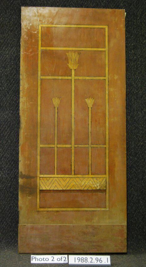 Interior / Exterior commercial door. Solid core. Flush panel. Veneered. One side has wood inlay ornamentation with botanical / geometric motif (badly damaged by weathering). Opposite side has botanical / geometric designed painted on. Both sides have masonite kick plates. All hardware is missing. Possibly from theatre,