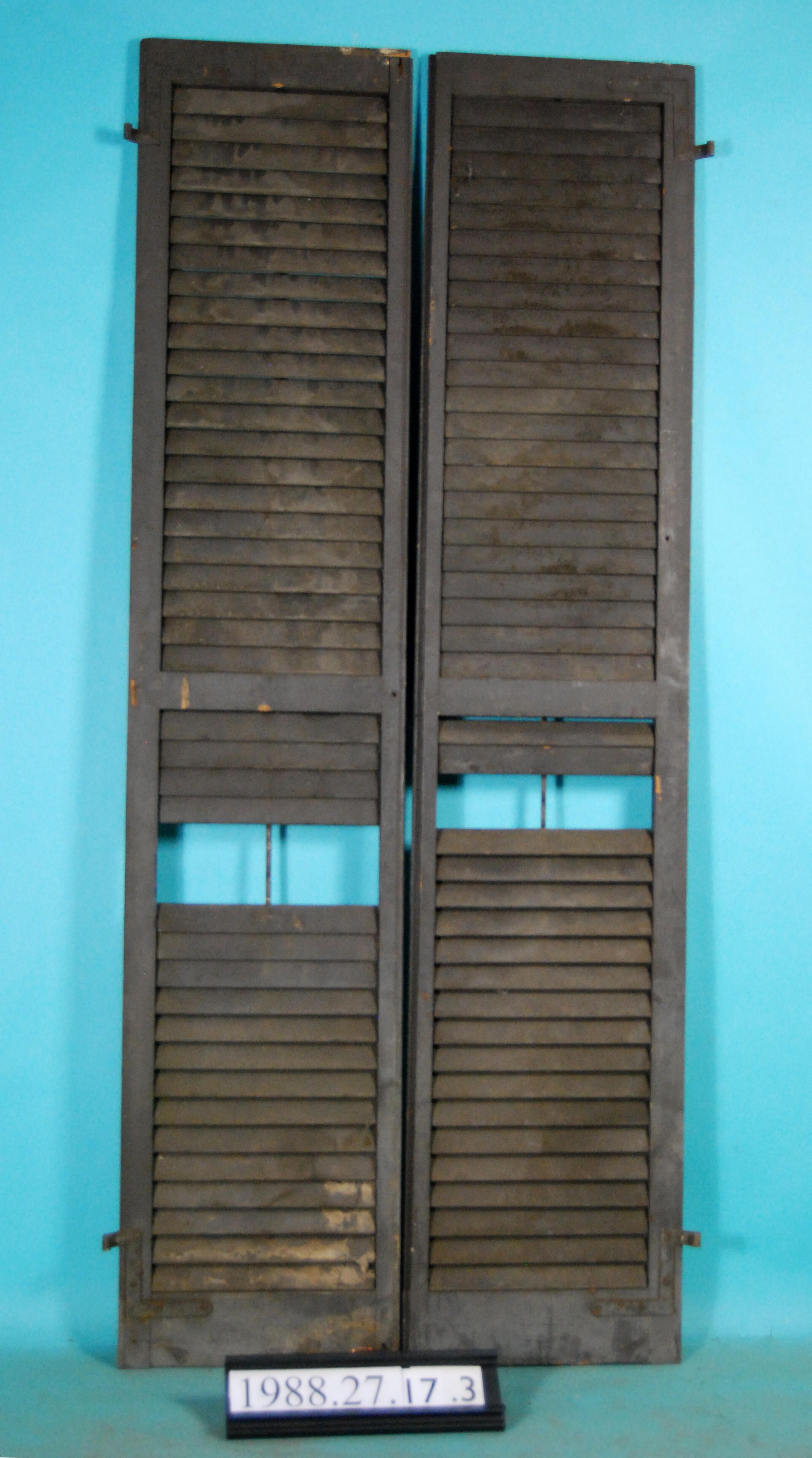 One pair exterior louvered shutters. All L-hinges. Finish is dark gray paint. Finish: dark gray paint Material: wood