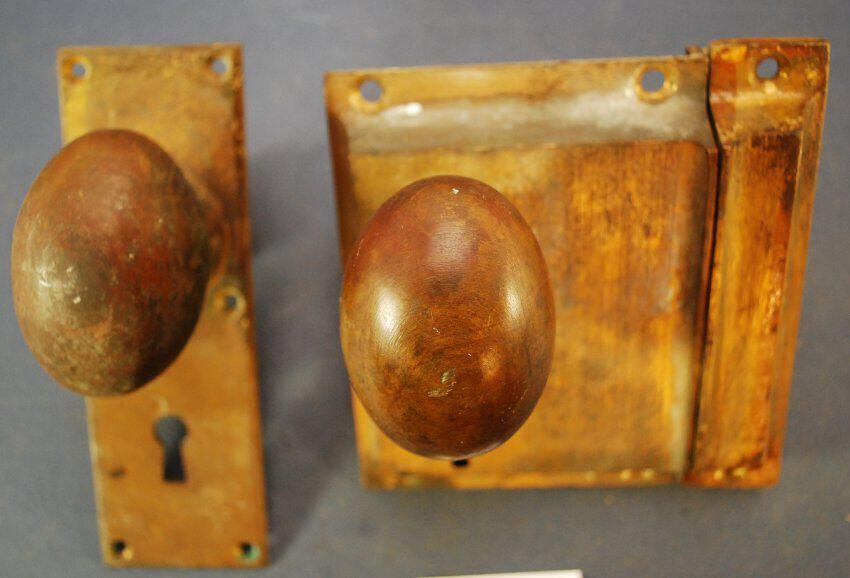 Comments: Has strike plate, pair of knobs, one escutcheon.Lexicon