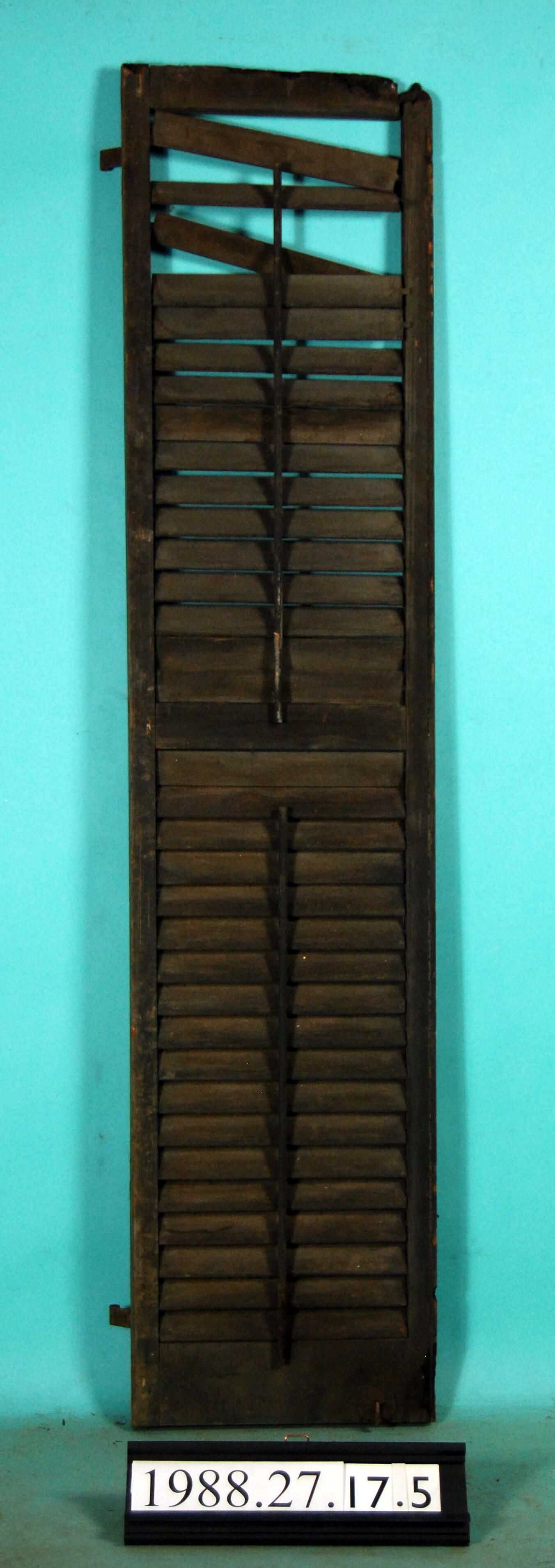 One exterior louvered shutter with two L-hinges, one latch. Burned upper rail. Finish is dark gray paint. Finish: dark gray paint Material: wood