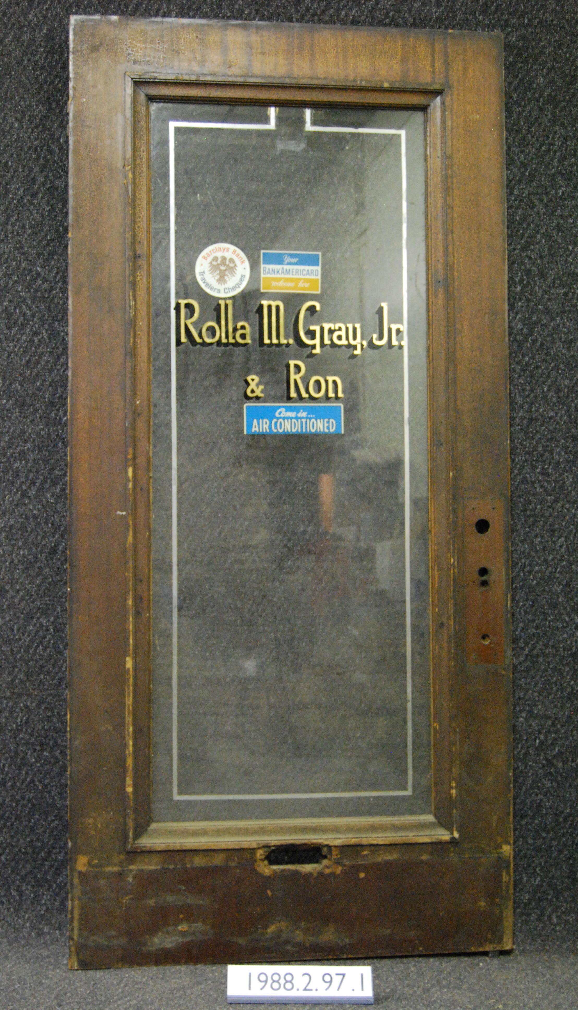 Exterior commercial door. Single opening with clear plate glass. Gold leaf inscription on glass: "ROLLA M. GRAY, JR. & RON." Has decal on glass: "AIRTEMP DIVISION OF CHRYSLER CORPORATION." Door is veneered with mahogany. Has moldings around opening to secure glass. Varnished on one side and speckle-painted on other side.