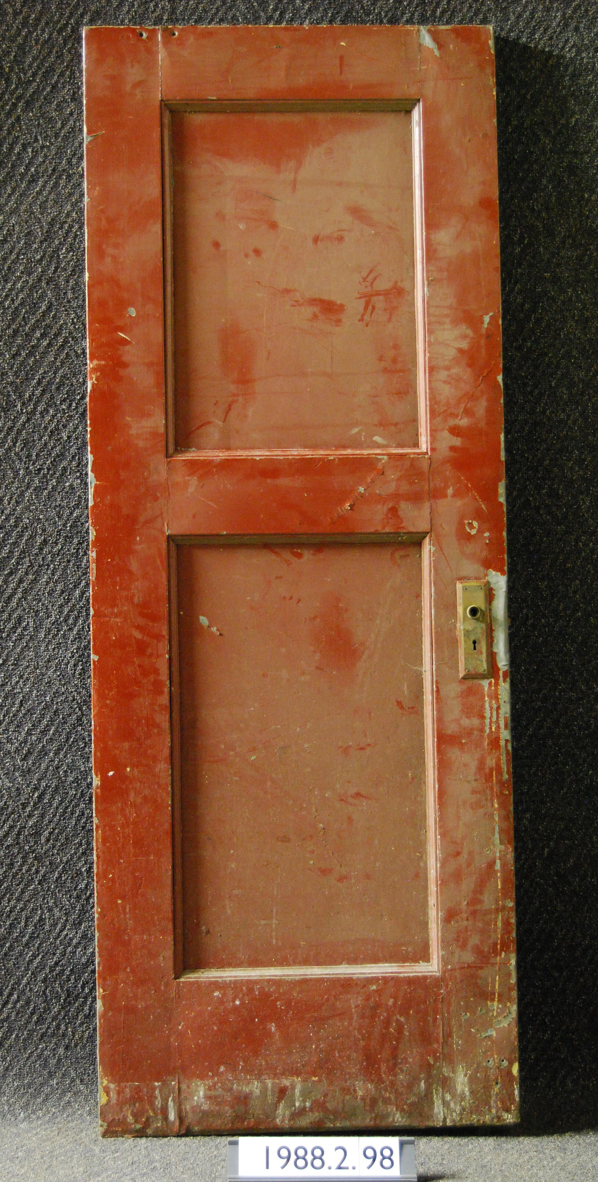 Interior / exterior door. Two panels. Wood frame clad with galvanized sheet iron. Has mortice lock.Has two escutcheon plates. All other hardware is missing. Painted red on one side - other side is painted beige. Probably what is known as Kalamein door, which is fire resistant and usually used in commercial buildings.