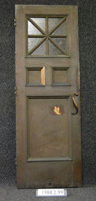 Exterior door. Wood frame clad with cupreous metal. Eight triangular openings divided by muntins. Colorless translucent "obscure" glass panes. Three panels with applied cupreous moldings. Has "S" curved cupreous handle. Three iron / steel hinge leaves. Brass lock strike plate at edge. Has loop hardware mounted at lower portion of exterior side of door. Has vertical bolts at top and bottom of edge of door.