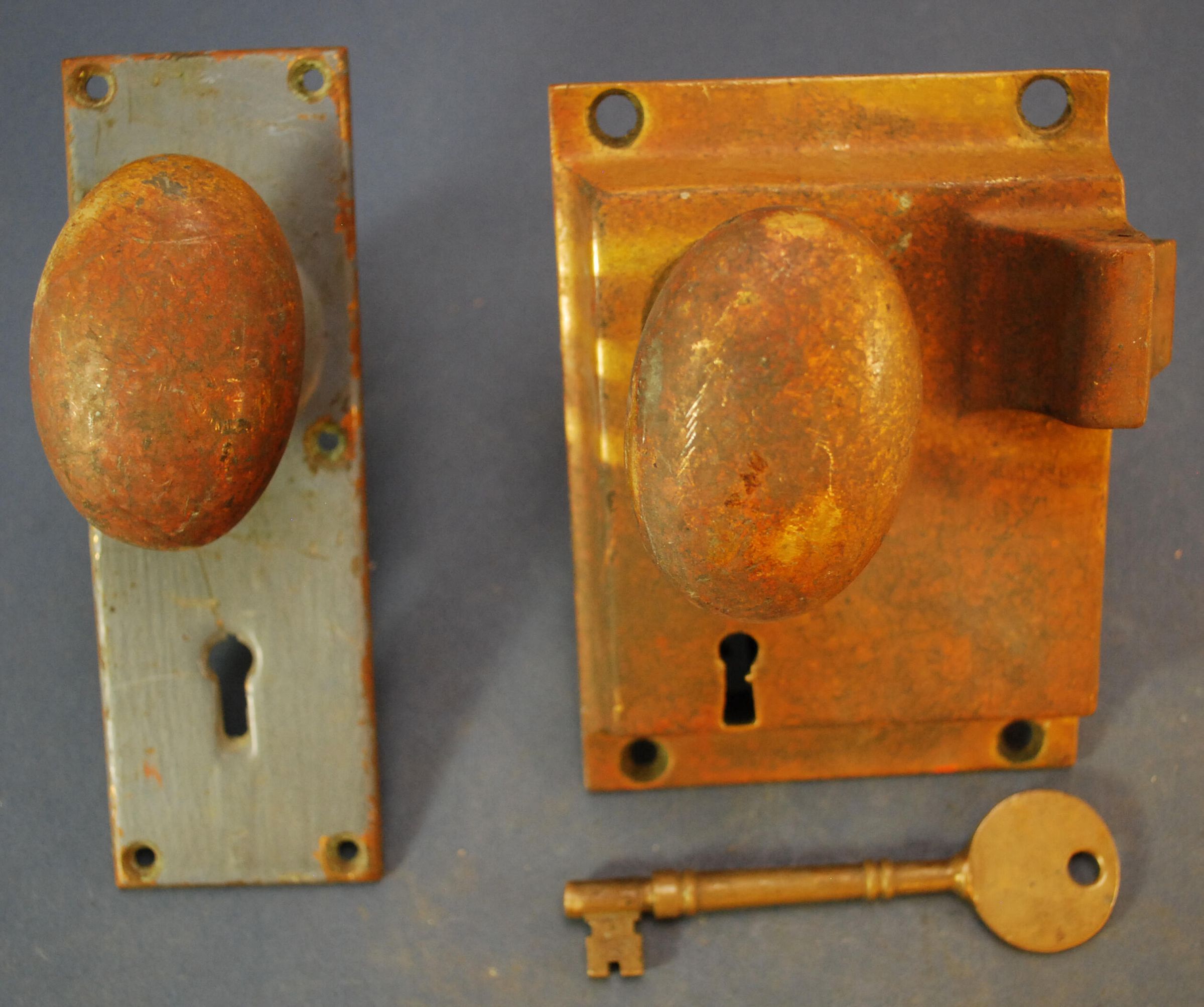 Comments: No strike, includes pair of knobs, escutcheon, and key. Battleship grey on escutcheon.Lexicon