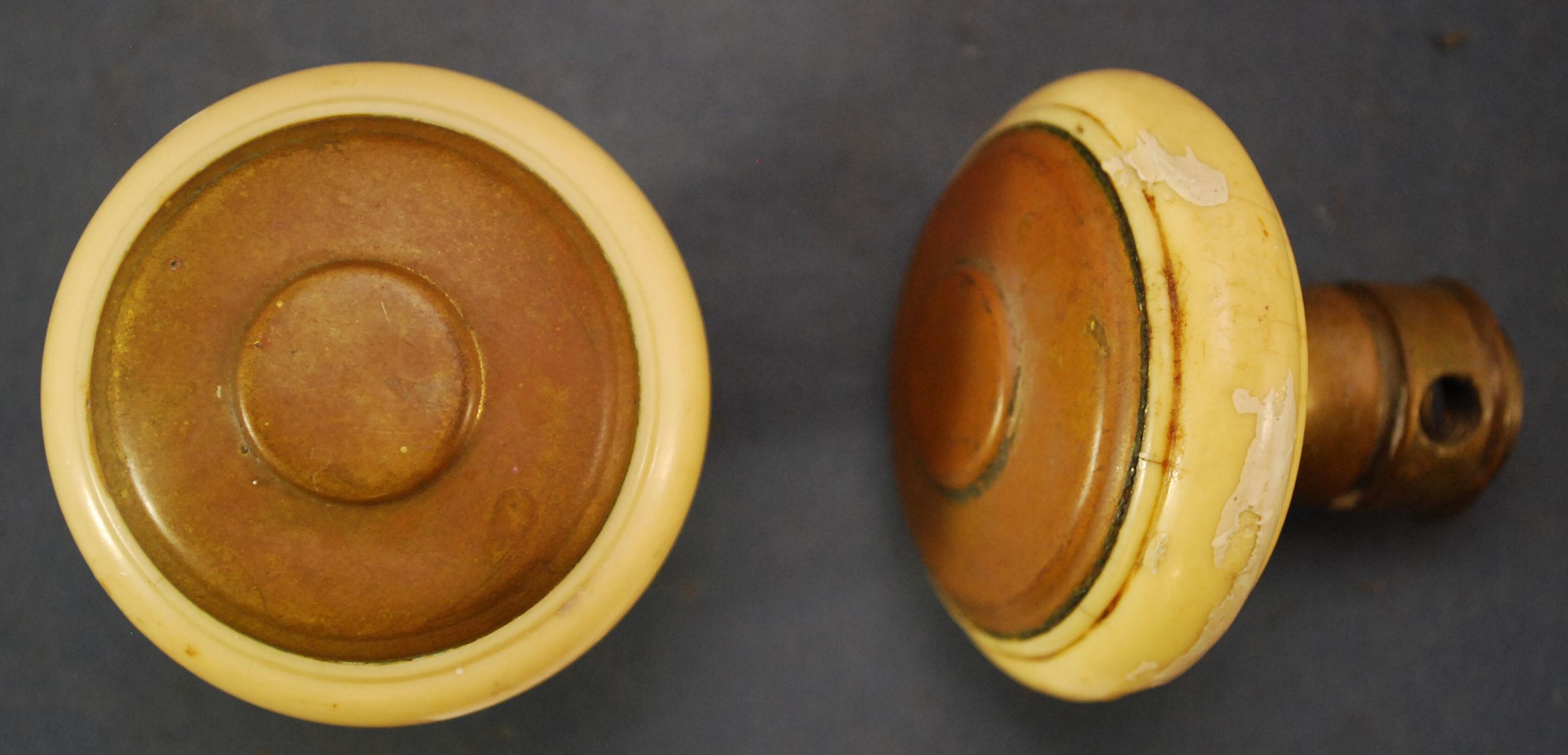 Design Name: Manufacturer: Unknown Style: Streamline / Modern Material: Brass Manufacturing Method: Stamped / mixed Surface Finish: Unpolished VDA Classification: VDA Number: Shape: Round Patent Specifics: Lock Type (If Applicable): Inscription/Makers Mark: Inscription Text: Comments: Some off-gassing, active deteriation